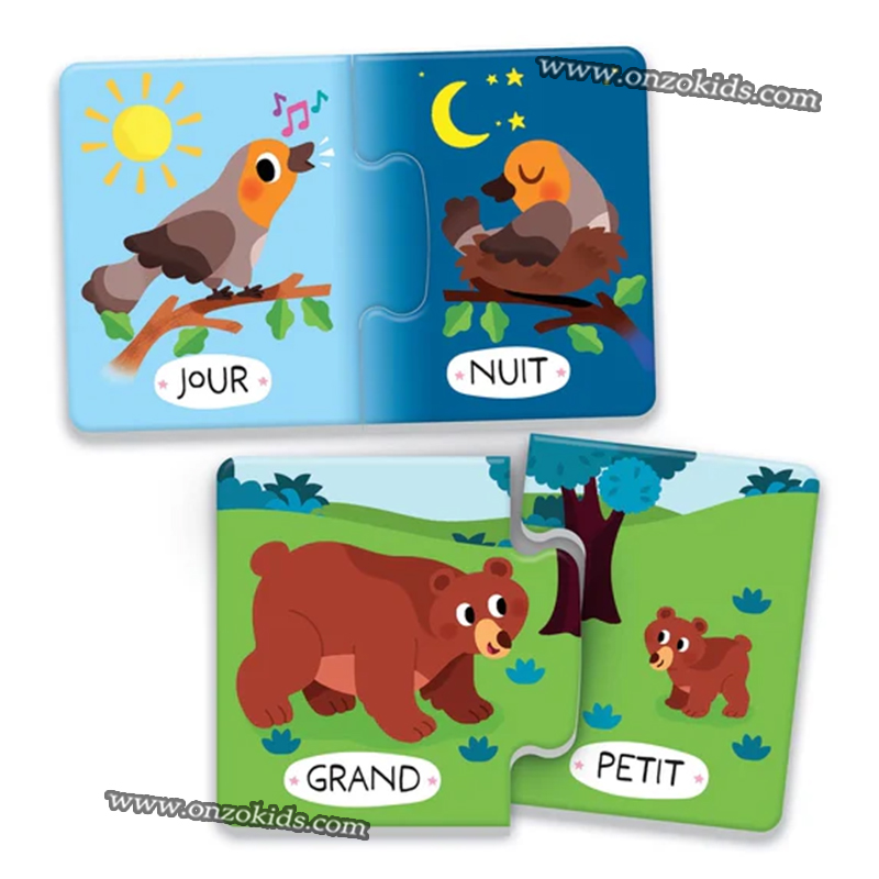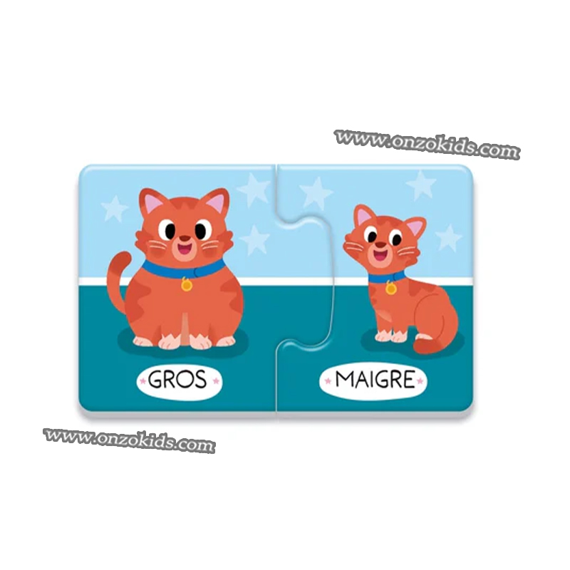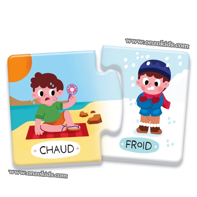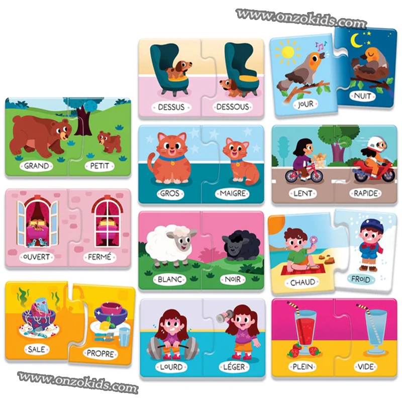 Un jeu d’association avec 16 mini-puzzles illustrés pour apprendre les contraires.