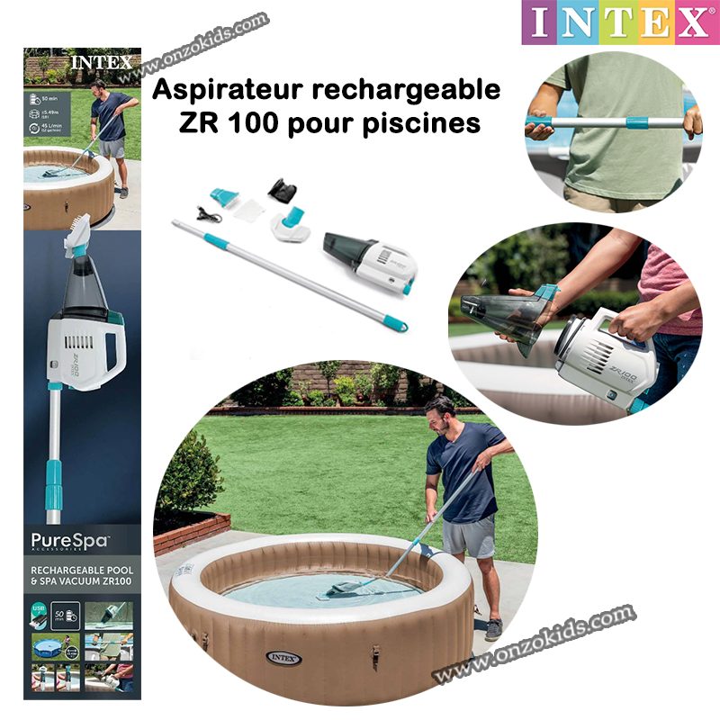 Le nettoyage n’a jamais été aussi simple et rapide ! L’Aspirateur Intex ZR100, avec batterie rechargeable, convient pour aspirer le fond de tous les spas d’hydromassage et de toutes les piscines hors sol d’un diamètre maximum de 549 cm. Comprend un manche télescopique léger en aluminium de 239 cm et deux têtes d’aspiration interchangeables. Il dispose d’une fonction d’arrêt automatique lorsque l’aspirateur n’est pas immergé dans l’eau et d’un interrupteur étanche IPX8 pour une meilleure protection. Avec 5 à 6 heures de charge vous disposez de 50 minutes d’autonomie maximale pour passer l’aspirateur !