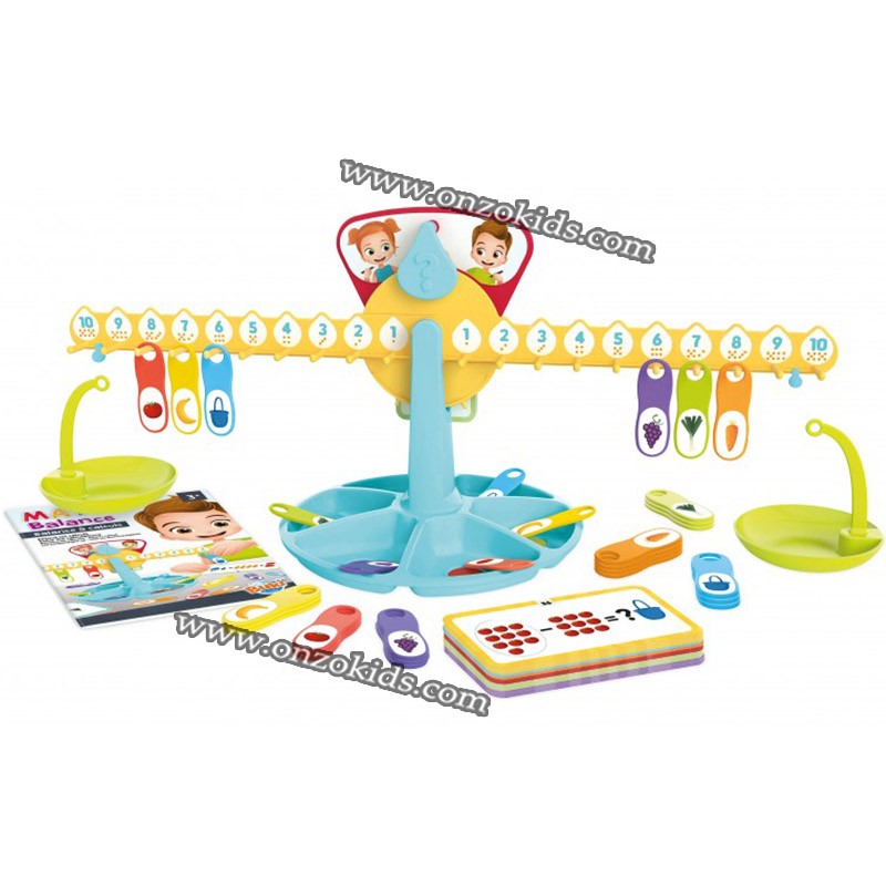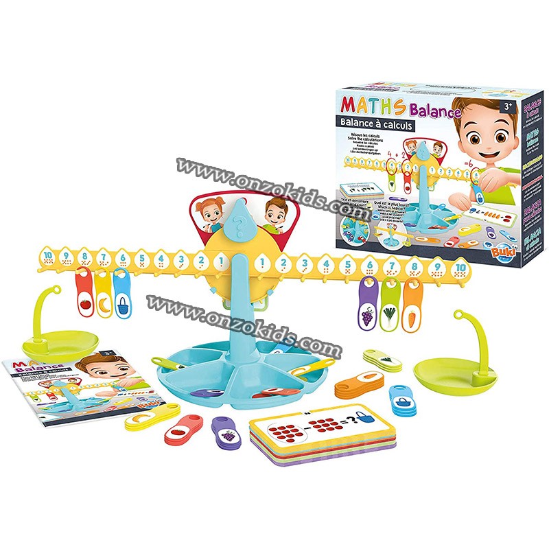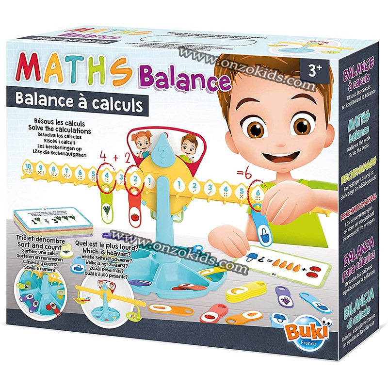 Les plus grands vont apprendre à compter en jouant! Pour trouver les réponses aux 60 énigmes fournies, l’enfant va accrocher les poids pour équilibrer la balance et obtenir le bon résultat!