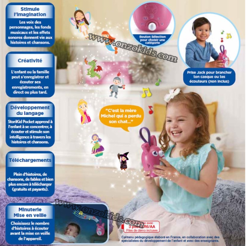 - Votre enfant découvre plus de 3h30 d’écoute réparties en histoires, chansons, histoires du soir et blagues ! le bouton Sélection à l’arrière du StoriKid Pocket permet de choisir la catégorie souhaitée.