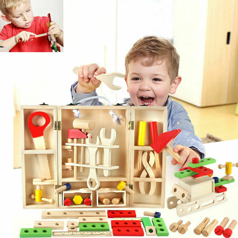 - Emballage: contient un étui de transport portable en bois durable avec une poignée de transport lorsqu’il est renversé. L’étui peut permettre aux enfants d’organiser ses jeux d’outils, des finitions non toxiques et des matériaux de sécurité pour enfants, vous permet de vous entraîner avec les petites mains et les petits doigts.