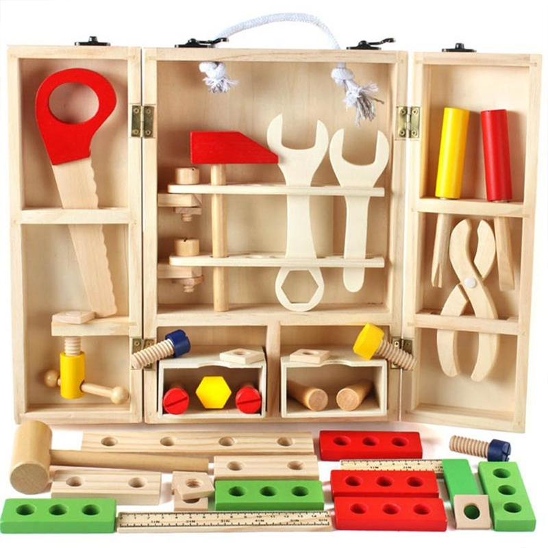 - Set Boîte à outils en bois pour créer des imaginations, y compris un étui, des tiroirs, une scie, des règles, un tournevis cruciforme, un tournevis droit, des maillets en bois, un marteau à griffe, des clés, des clous, des vis, des pinces et une grande variété de pièces en bois.