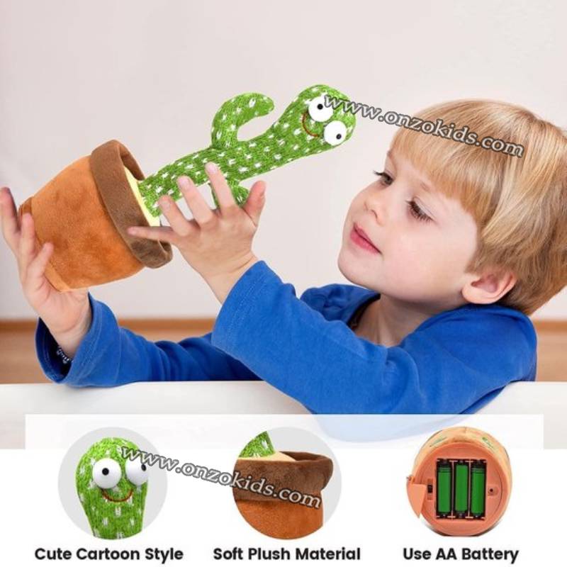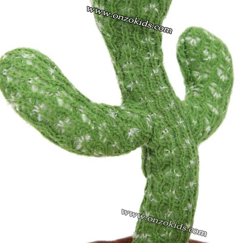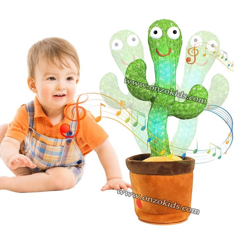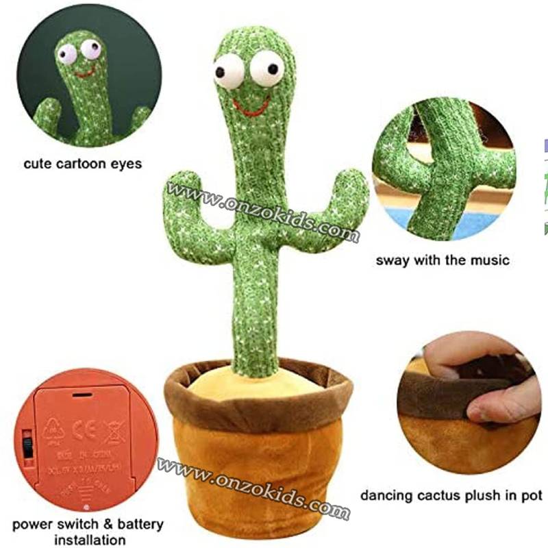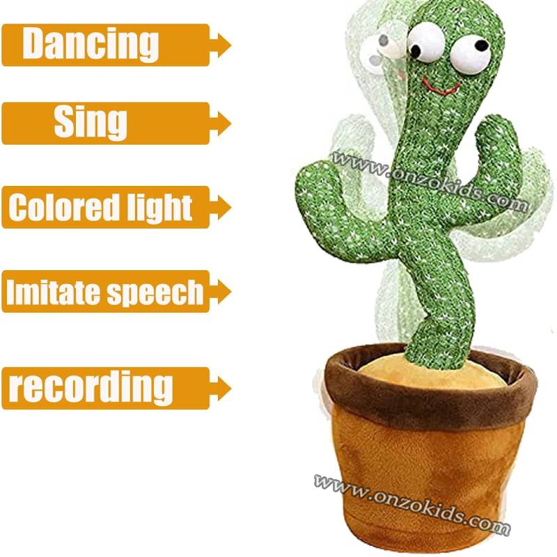 Le jouet en peluche cactus il peut chanter et danser sur plusieurs musiques , il répète tout ce qu’il entend , il s’éclaire grâce à ses veilleuses intégrées et il enregistre des phrases entières tous ça pendant des heures et donner un bon moment aux enfants.
