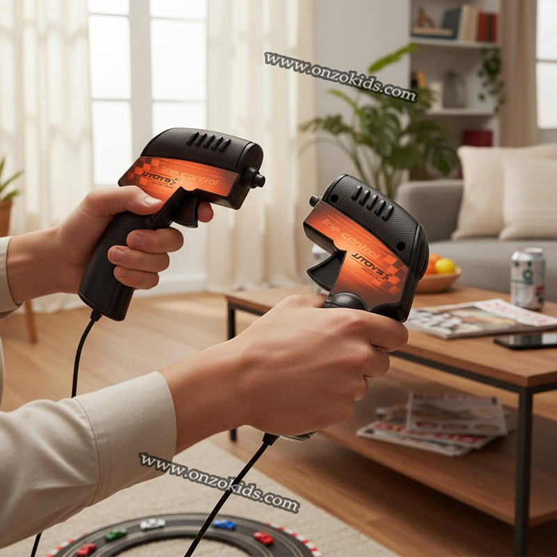 Le jeu comprend deux voitures de course et deux manettes filaires, fonctionnant grâce à un adaptateur électrique et reliées à la piste par des câbles.