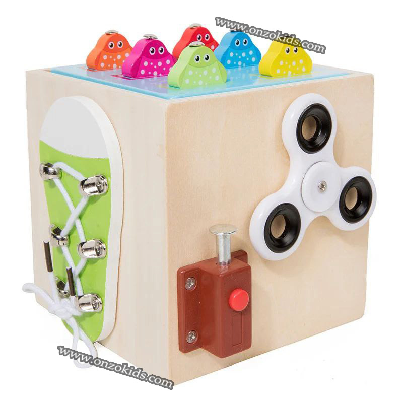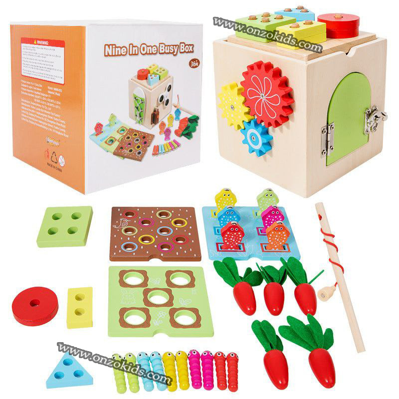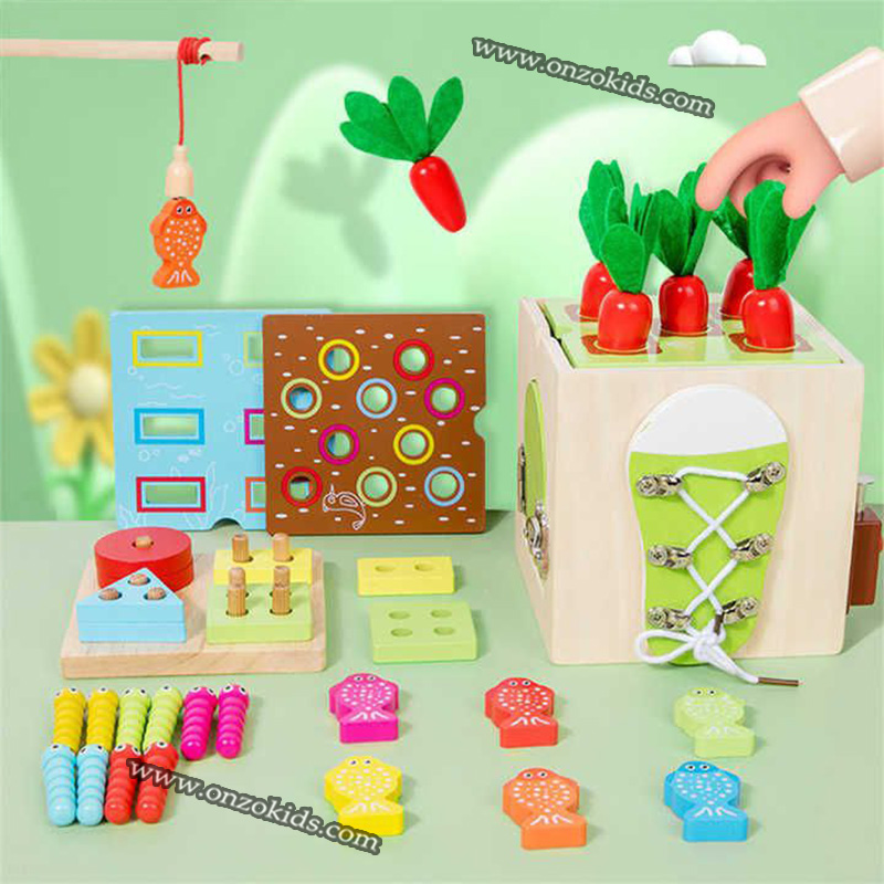 L’ensemble de jeu comprend : un trieur de carottes, un jeu de pêche, un jeu de vers et un trieur de formes, et les côtés du jouet ont des engrenages, une porte avec une serrure, une serrure avec un bouton, un jeu de nouage de ficelle et une toupie.