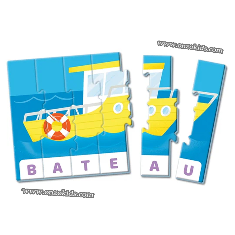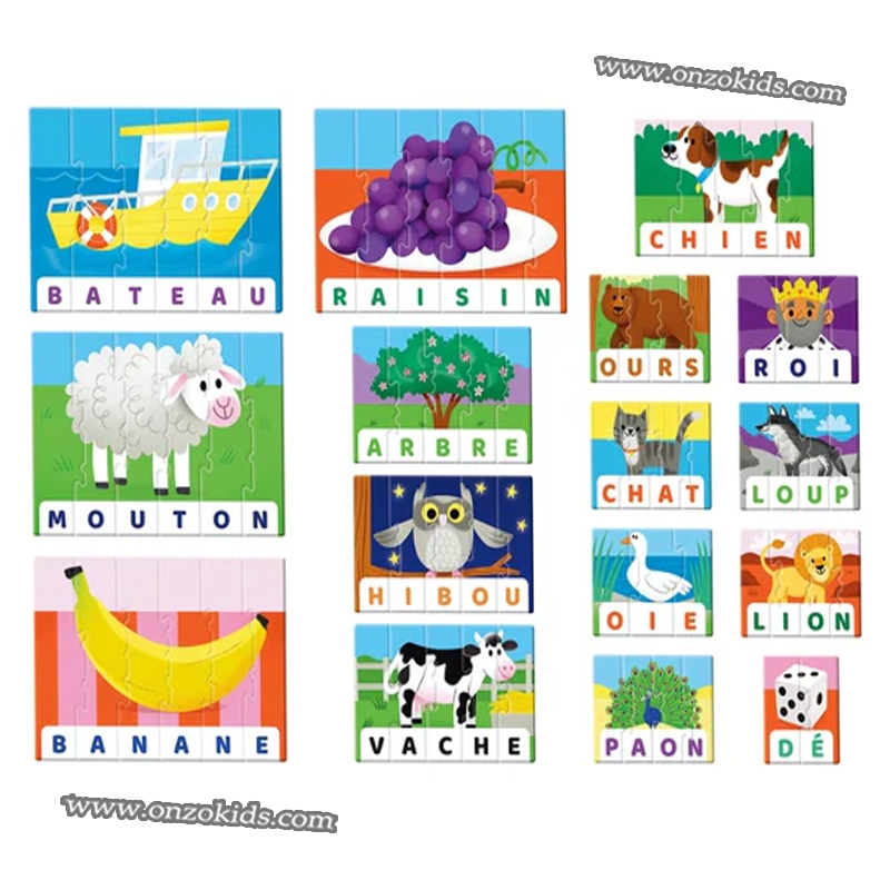 Un jeu éducatif simple et ludique avec 16 puzzles destinés à apprendre aux enfants à composer leurs premiers mots.