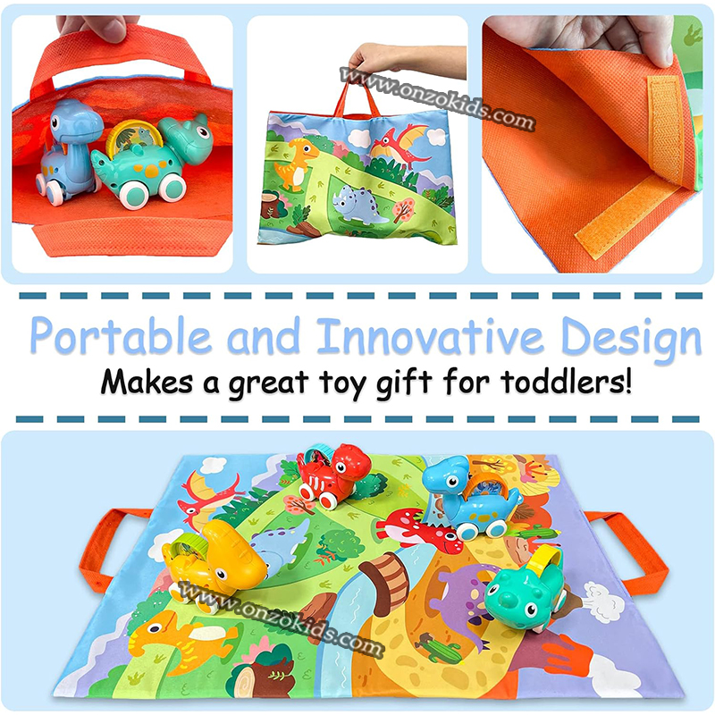 Pratique et portable : Le tapis de jeu se plie facilement pour devenir un sac de rangement où les voitures de dinosaures peuvent être rangées, permettant ainsi à votre enfant de jouer à la maison ou en extérieur, où qu’il soit.