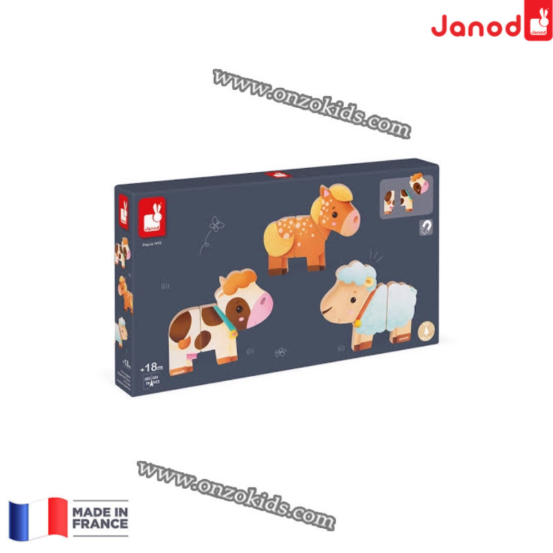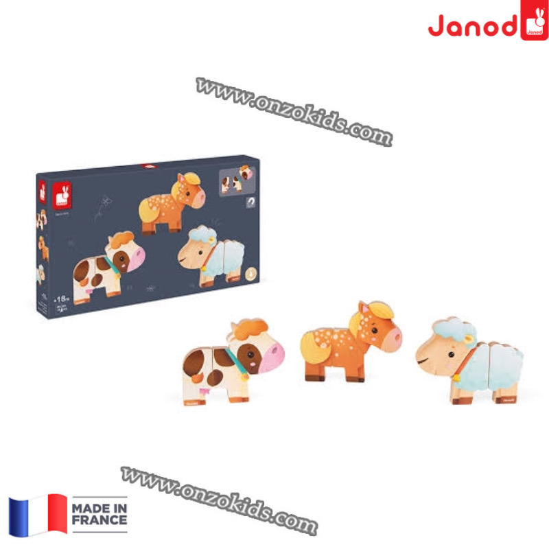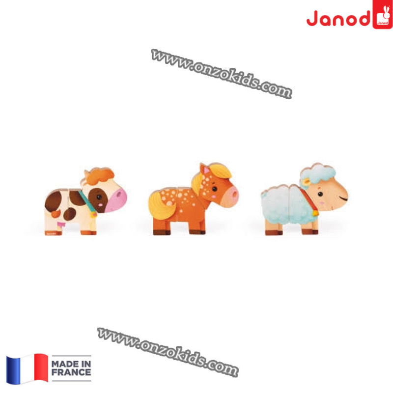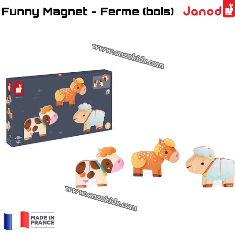 Jouet en bois. Pour enfants de 18 à 36 mois. 3 animaux en 3 parties magnétiques à décomposer, mélanger, reconstituer à l’infini. Un joyeu jeu d’association et d’imagination. Boite couleur fermée