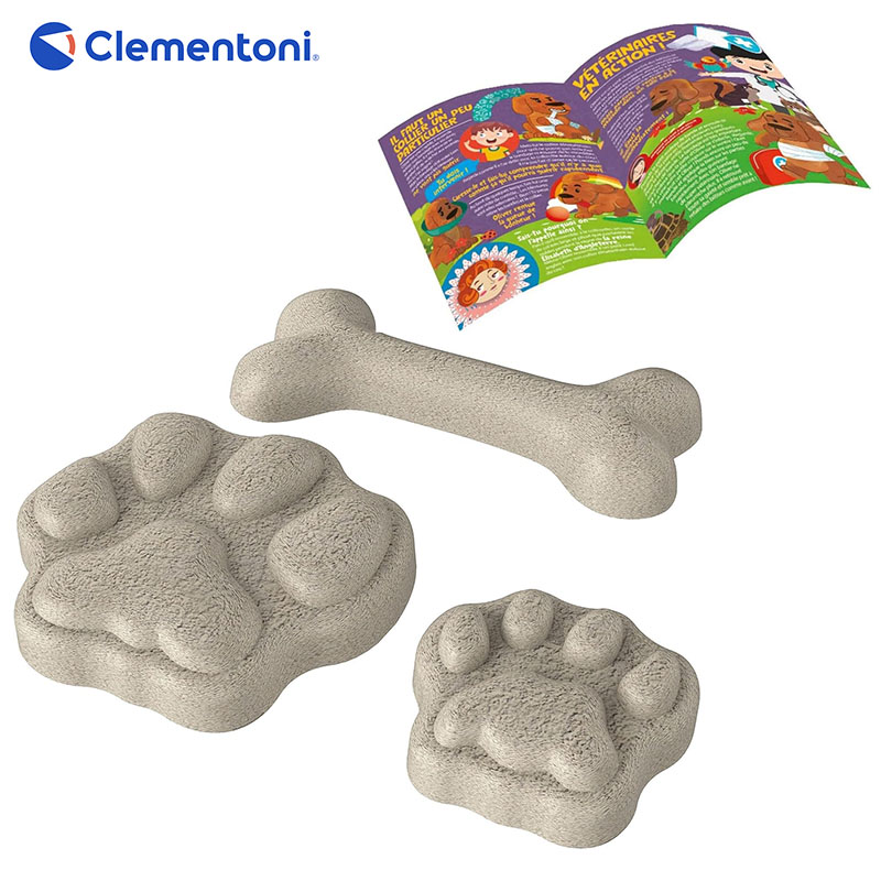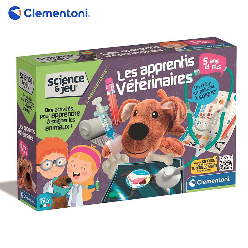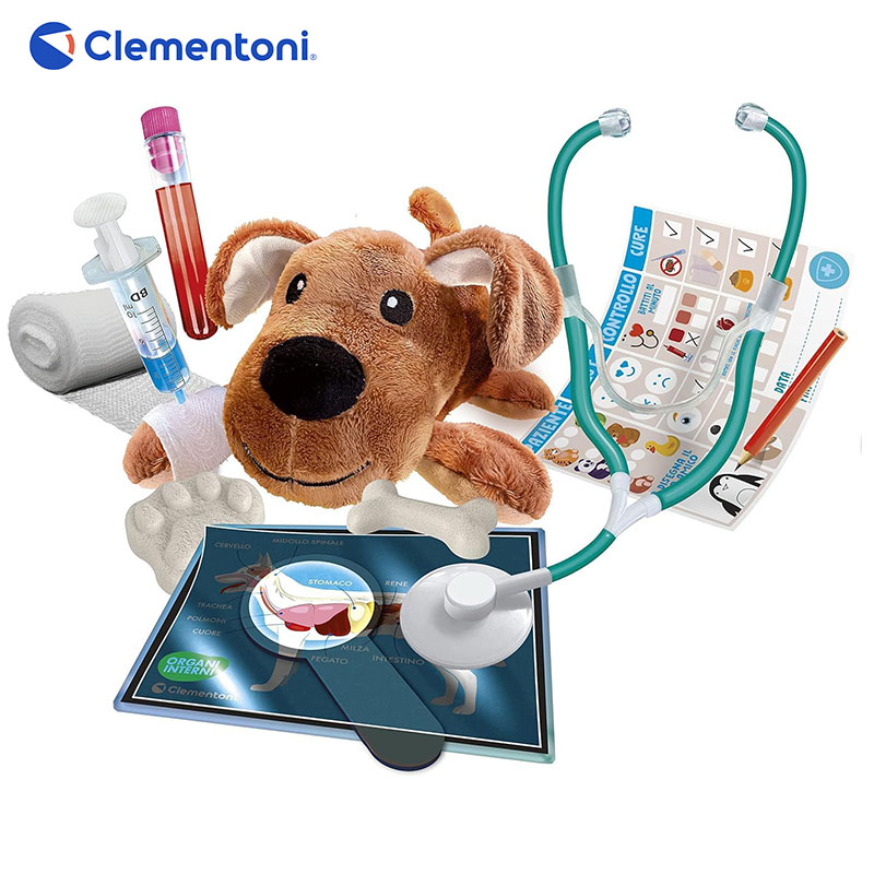 CONTENU DU COFFRET: Une douce peluche à entretenir et tout le nécessaire pour le faire au mieux comme stéthoscope, bandages, tubes à essai, gaze, un collier spécial, des cartes anatomiques rayons X et un manuel illustré,