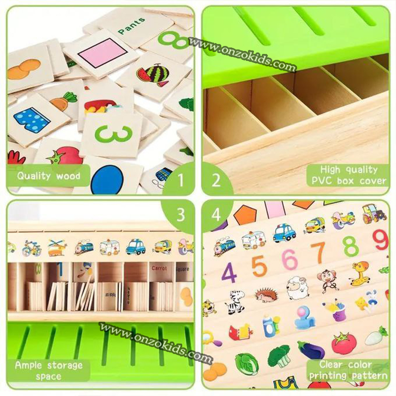 Le jouet en bois est robuste et durable et aucun éclat n’a été trouvé. Nous veillons à ce qu’il soit entièrement testé et certifié selon les normes de sécurité des jouets ASTM.Jouets Montessori pour les enfants âgés de 2 à 4 ans. En identifiant les motifs et les couleurs, c’est la ressource d’apprentissage parfaite pour les bébés dès l’âge de 3 ans. Pour les enfants de 3 ans et plus, les parents peuvent demander à leurs enfants de faire correspondre des mots anglais aux bons objets et de les nommer.Liste des produits : un corps principal + 80 cartes classées + 8 films de navigation classésLes tout-petits peuvent apprendre les bases en comptant et en triant les nombres, les couleurs, les catégories et les motifs.