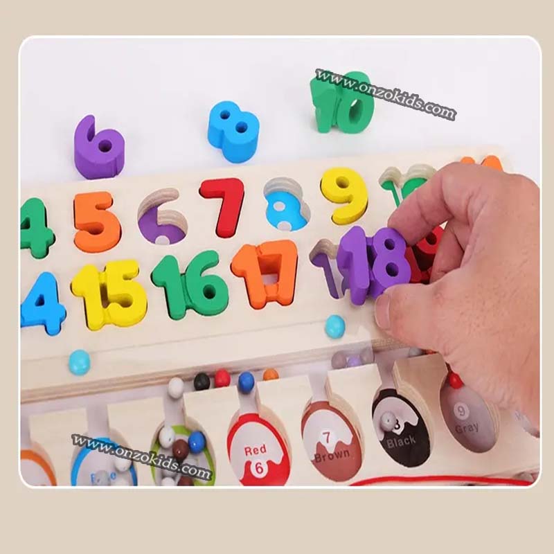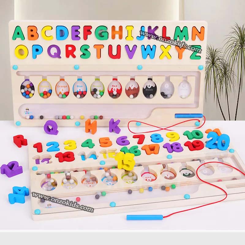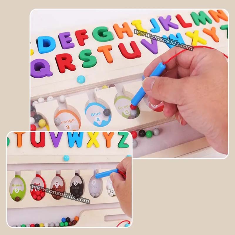 Les billes sont placées dans une plaque acrylique transparente, ce qui empêche efficacement bébé de les avaler ou de les faire tomber. Les chiffres et les lettres sont agrandis et épais, ce qui facilite leur préhension et évite qu’ils ne les avalent accidentellement.