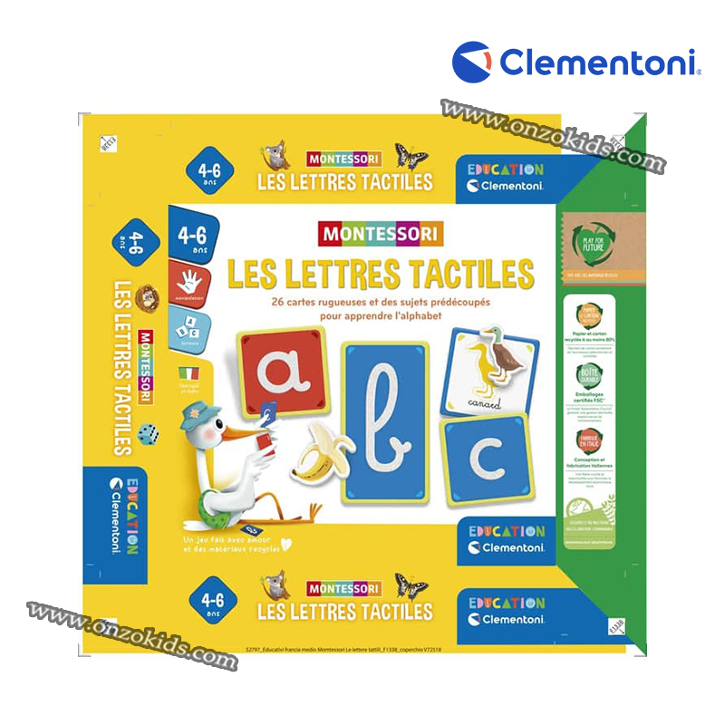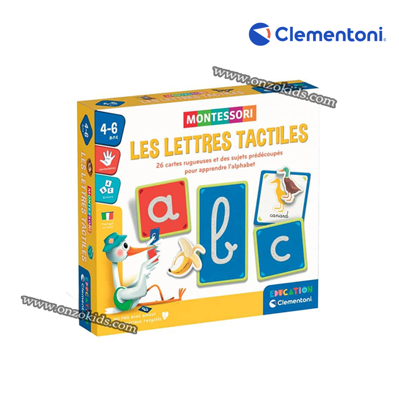Ce jeu, inspiré de la méthode Montessori, est basé sur la perception tactile : les cartes à finition rugueuse permettent à l’enfant de mémoriser la forme des lettres par le toucher.