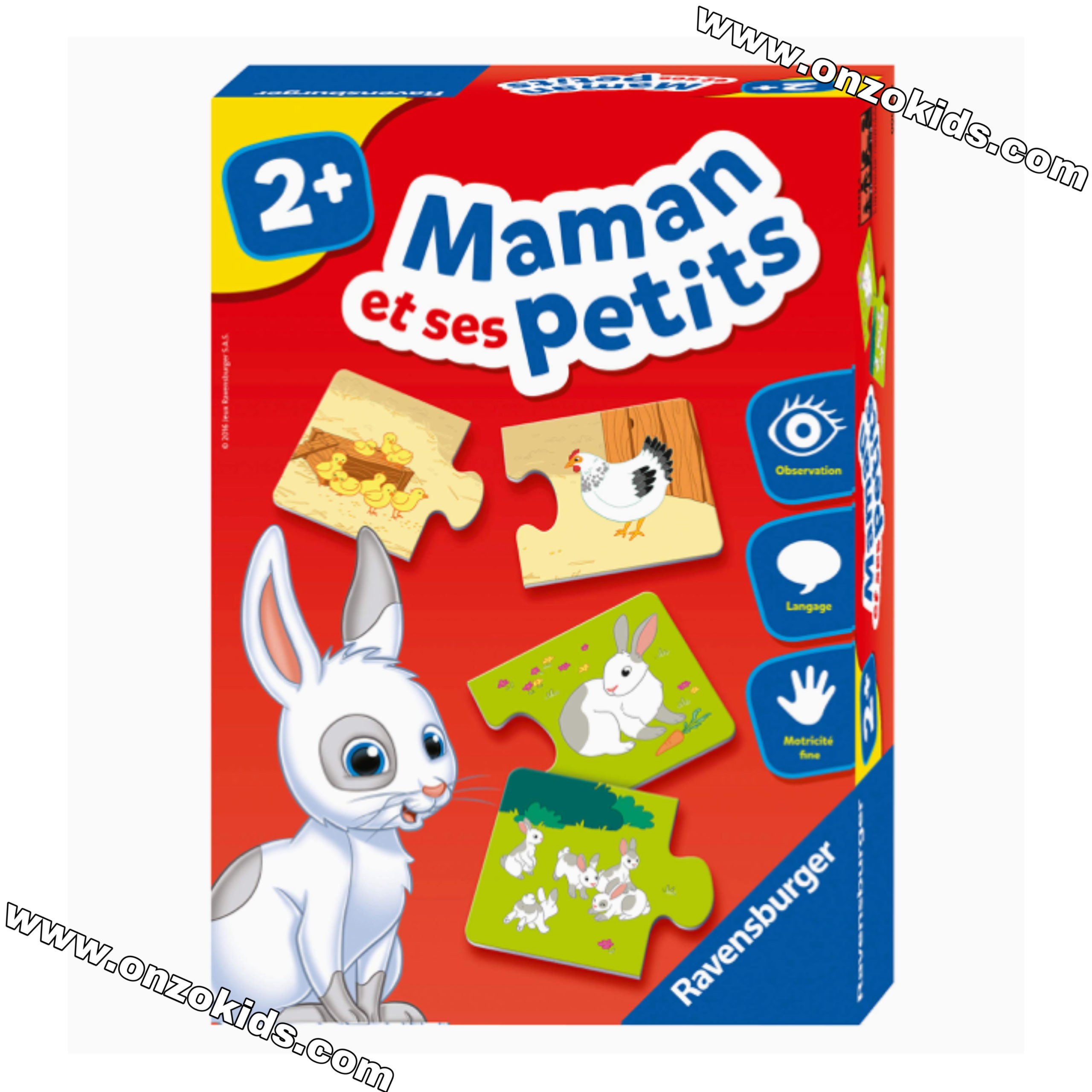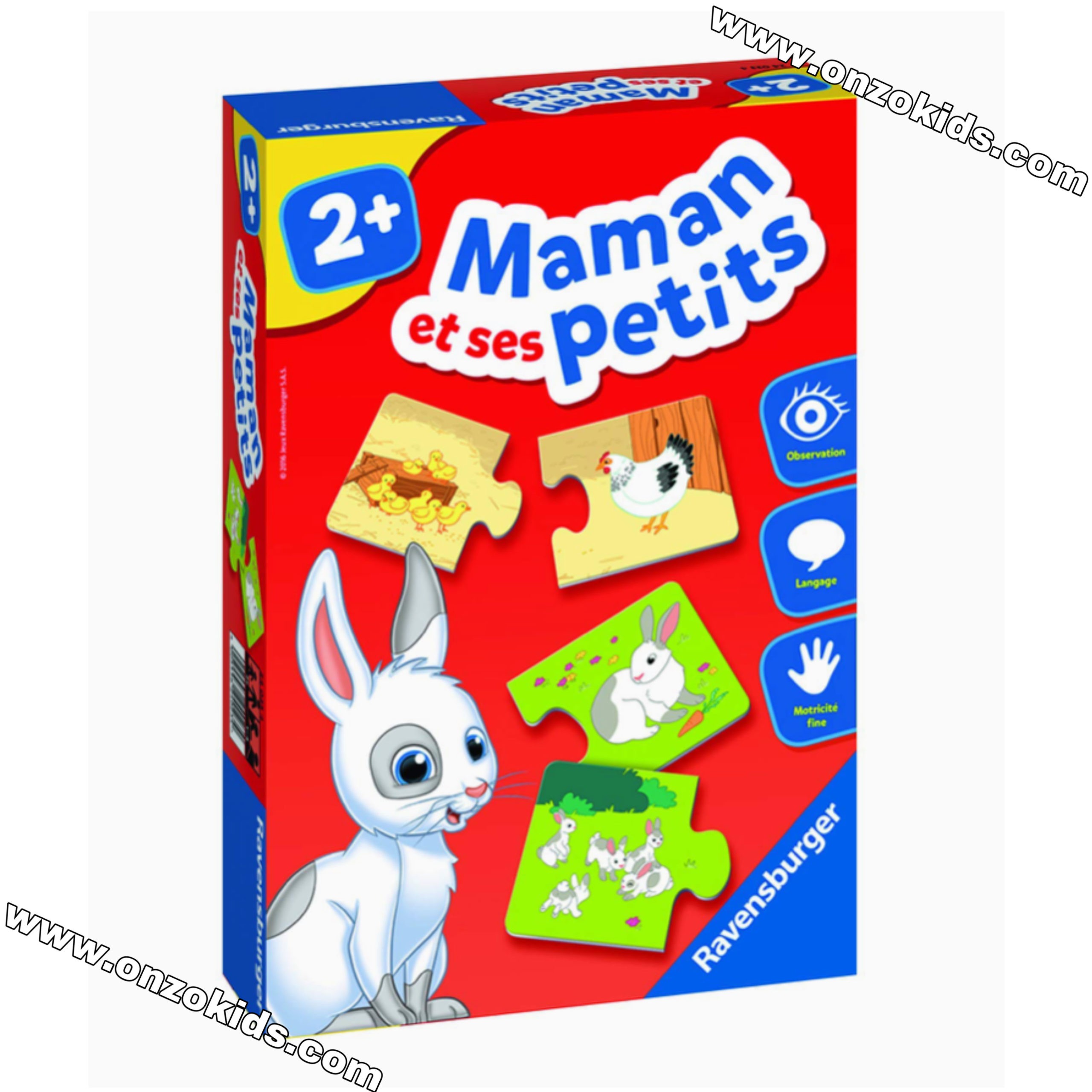 Les enfants sont particulièrement fascinés par les animaux. Le jeu « Maman et ses petits » leur propose de découvrir les animaux dans leur environnement et d’apprendre leur nom. Dans cet univers de jeu très tendre, il faut retrouver les petits de 12 mamans. Grâce aux pièces de puzzle autocorrectives, l’enfant joue à réunir les familles en toute simplicité et peut vérifier lui-même s’il a correctement associé les images. Les cartes extra épaisses lui offrent un confort de jeu optimal pour jouer et rejouer, encore et encore !Ce jeu favorise ainsi le sens de l’observation, le développement du langage, du vocabulaire lié aux animaux, et de la motricité fine. A partir de 2 ans.