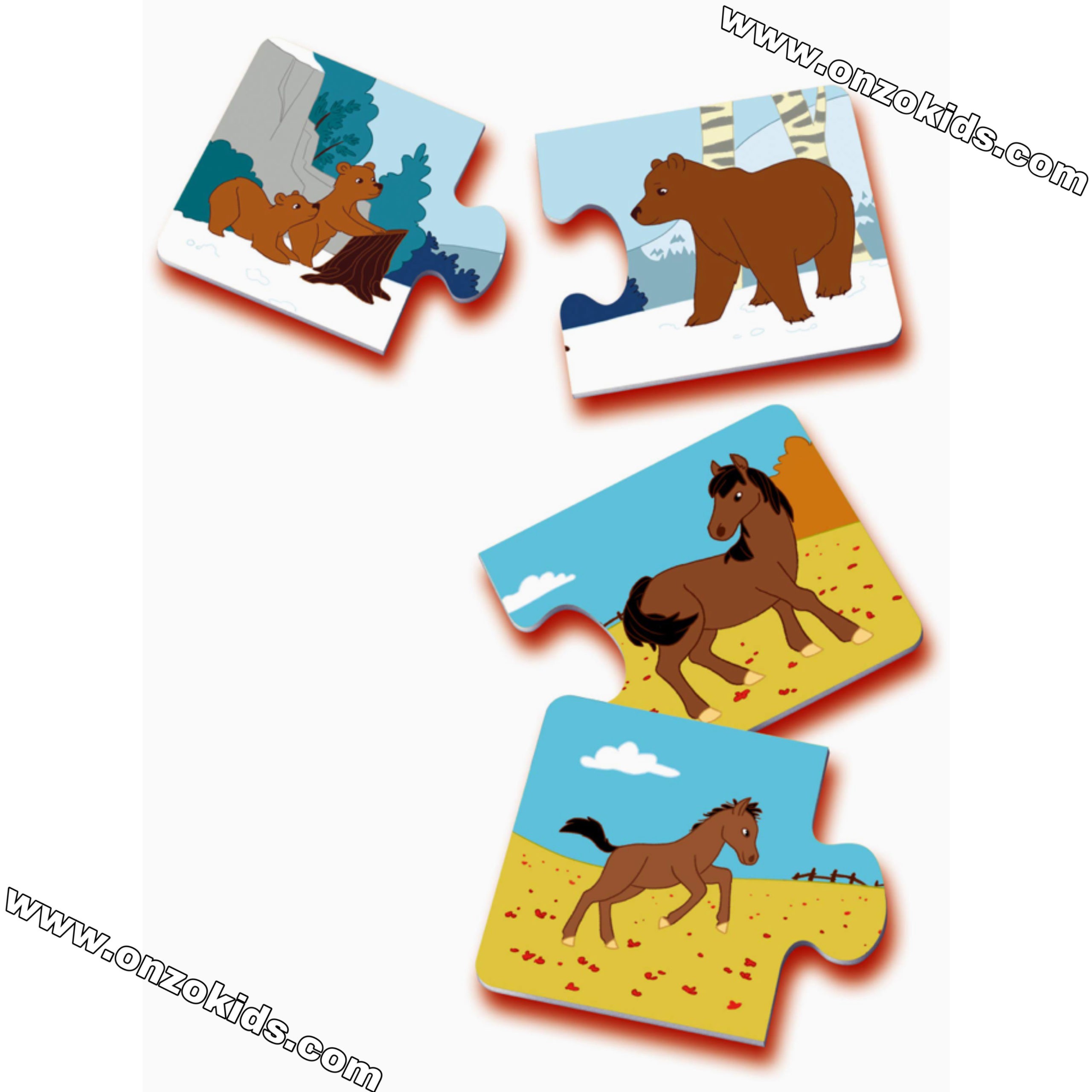 - Grâce aux pièces de puzzle autocorrectives, les enfants jouent à réunir les petits et les mamans en toute simplicité et peuvent vérifier eux-mêmes s’ils ont correctement associé les images.