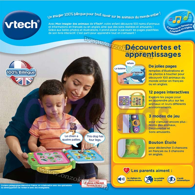 Avec Mon imagier des animaux bilingue, votre enfant découvre 100 noms d’animaux et informations en français ou en anglais ainsi que des sons réalistes et amusants !