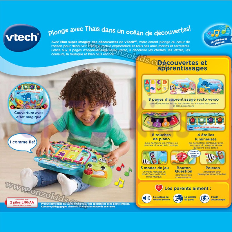 Avec Mon super imagier des découvertes, votre enfant plonge au coeur de l’océan pour découvrir Thaïs, la tortue exploratrice et tous ses amis marins et terrestres.