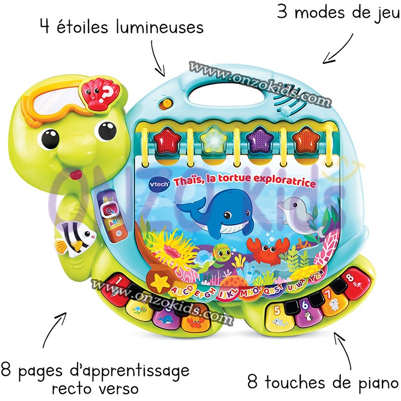 Il découvre les chiffres, les animaux et joue de la musique à l’aide des 8 touches de piano.