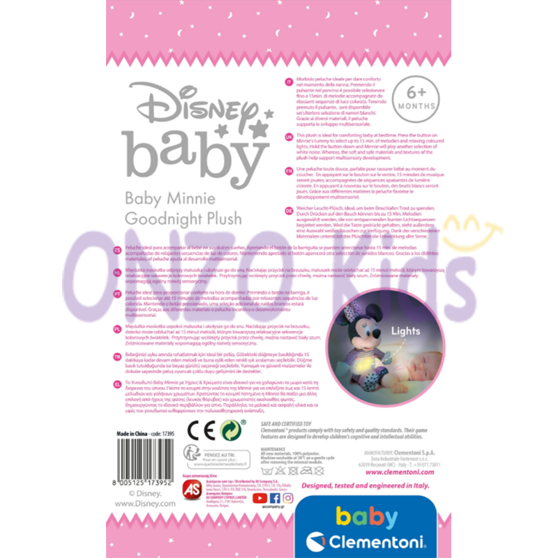 - Une peluche interactive douce et raffinée Baby Minnie pour accompagner en douceur les enfants à l’heure du coucher.