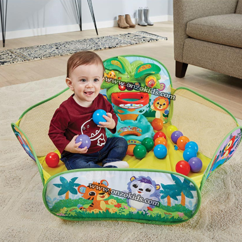 Dans sa Piscine à balles interactive des P’tits loulous, votre enfant s’amuse à lancer les balles dans le panier et les fait rouler le long des toboggans. Trop rigolo ! Avec ses 30 balles colorées et son mètre de diamètre, cette piscine à balles complète et interactive encourage l’exploration et l’apprentissage des couleurs, des nombres et des animaux. Les nombreuses interactions sonores et visuelles stimulent les sens de votre enfant et l’accompagnent dans le jeu.