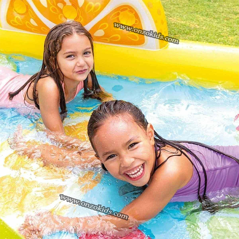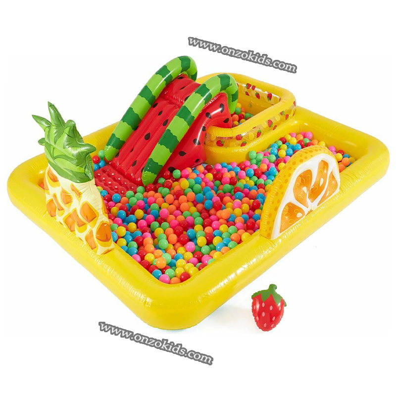 À la fin de la glissade il y a un coussin gonflable très confortable qui adoucit la descente et le live-motiv de la piscine gonflable sont les fruits, en fait l’ananas, les fraises et l’orange sont représentés.