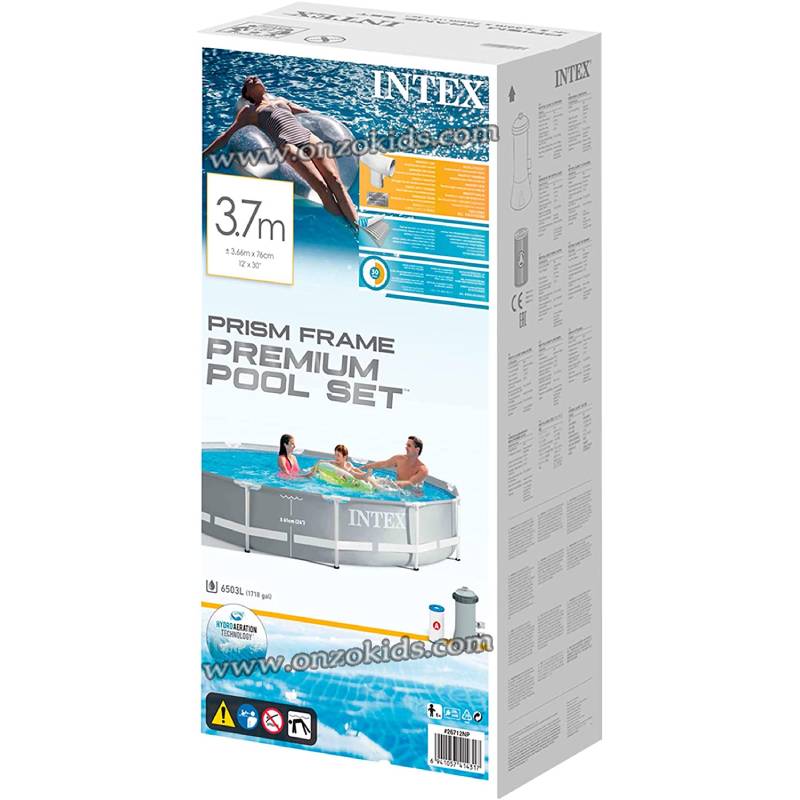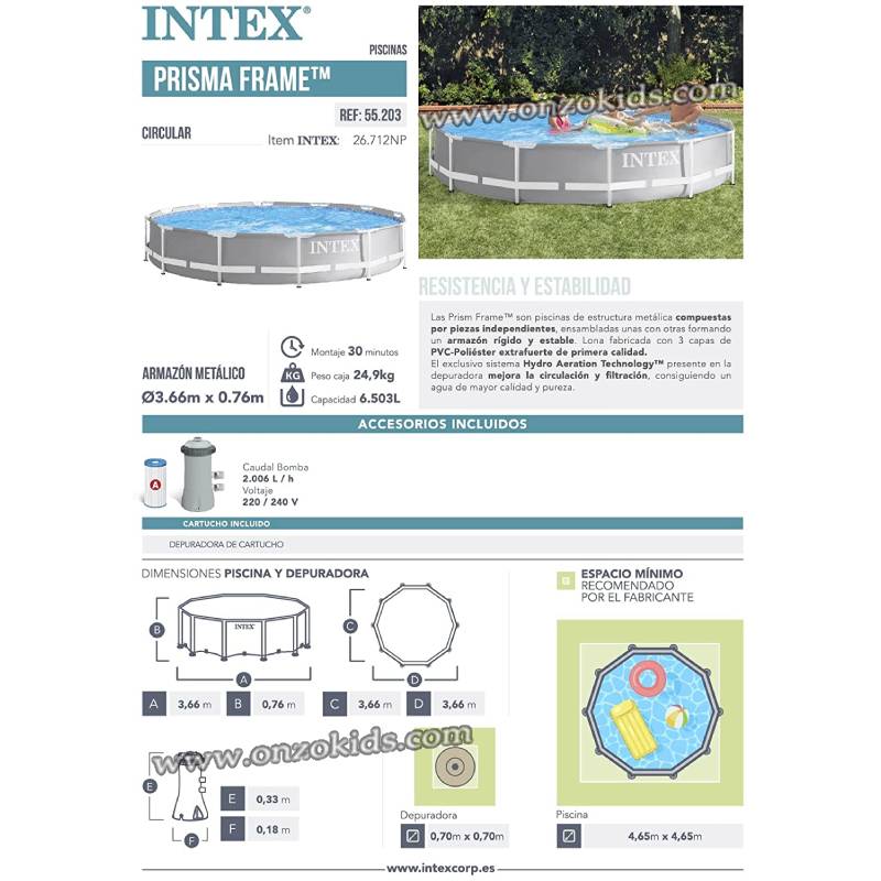- Piscine ronde INTEX Prism Frame, dimensions de la piscine : 366 x 76 cm et capacité : 6 503 litres .