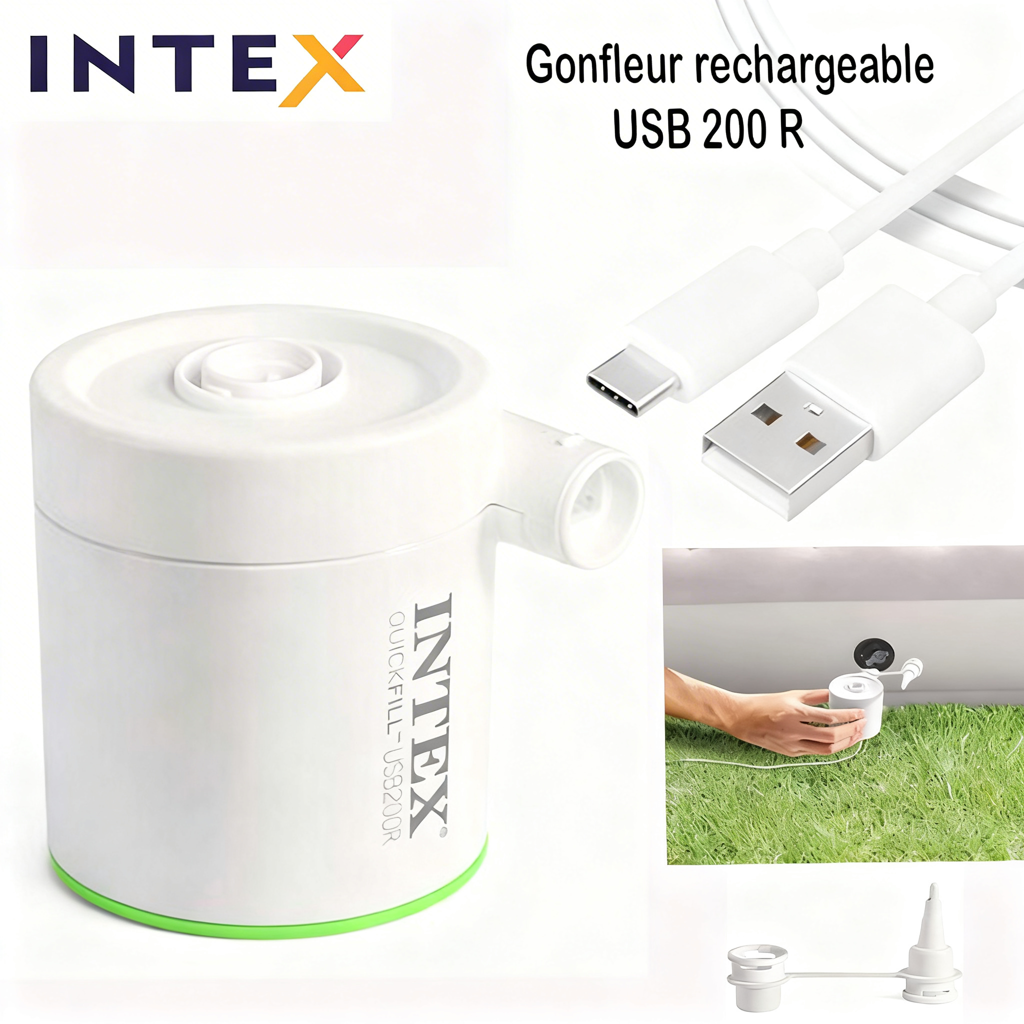 Grâce au cable USB (Type-A / Type-C) d’une longueur de 1,8 m fourni, le gonfleur Intex peut également servir de chargeur externe pour téléphone portable.