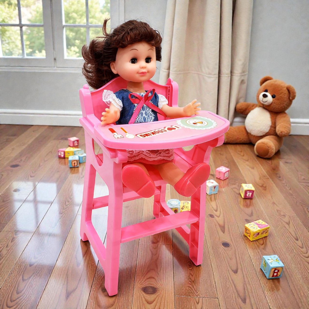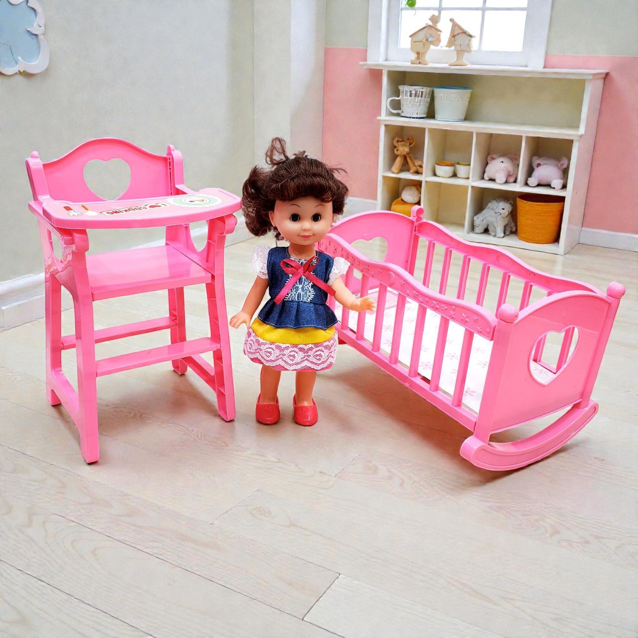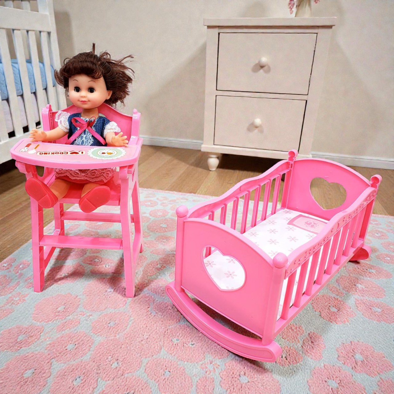 Le coffret comprend une chaise haute et un berceau, permettant à l’enfant de prendre soin de sa poupée comme un vrai bébé : la nourrir, la coucher et inventer de belles histoires pleines de tendresse.
