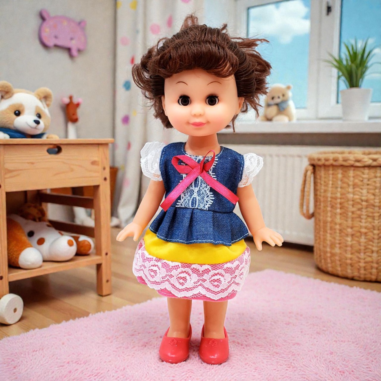 La poupée, habillée d’une jolie robe tendance, est accompagnée de beaux accessoires pour recréer des scènes du quotidien.