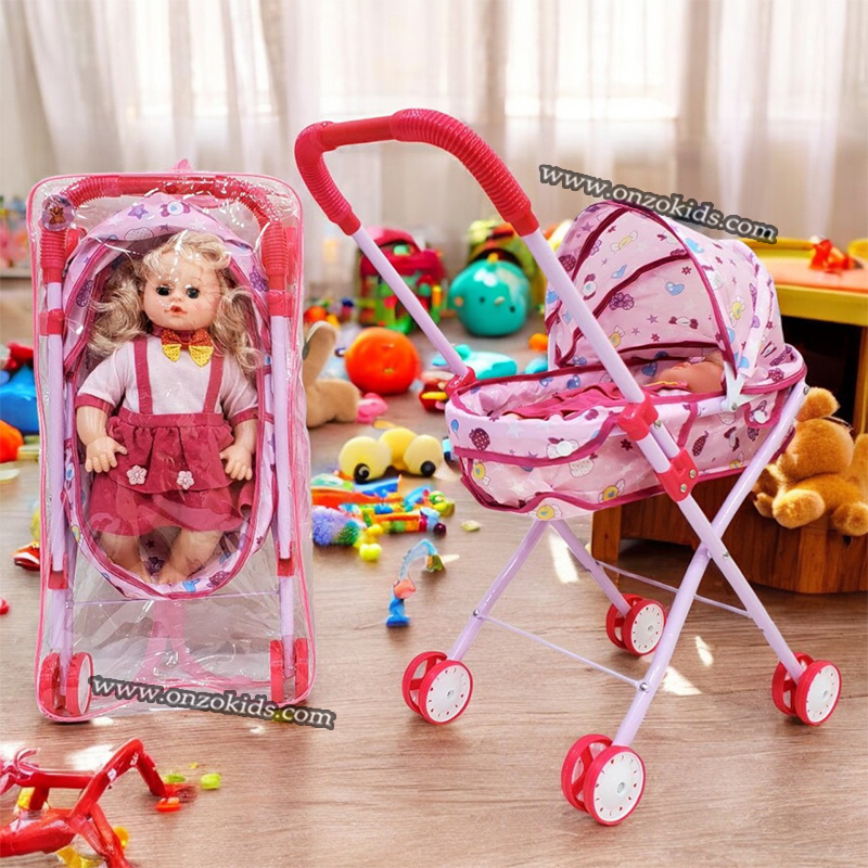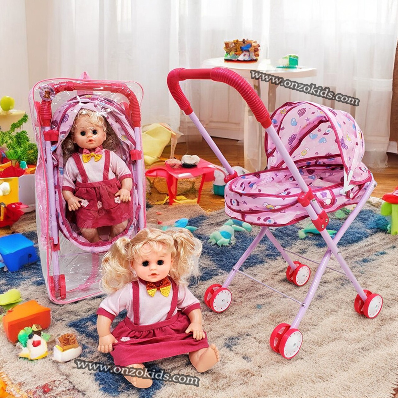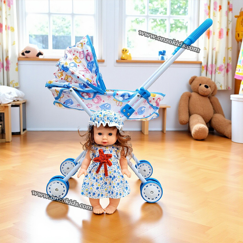 Elle est habillée d’une tenue élégante et soignée : une petite robe pastel avec des détails en dentelle et un bonnet assorti. Ses cheveux sont soigneusement coiffés en boucles ou tresses, selon le modèle. La poussette landau, inspirée des designs vintage, est réalisée en métal et plastique de haute qualité. Elle est peinte dans des tons doux comme le rose, le beige ou le blanc, et dispose d’une capote ajustable. Les roues robustes permettent un déplacement fluide, et le panier sous la poussette est parfait pour ranger des accessoires de poupée comme des biberons ou des couvertures. Ce jouet invite à de longues heures de jeu d’imitation, stimulant la créativité et l’imagination des enfants. Idéal pour les petits dès 3 ans, il fait un cadeau merveilleux pour les occasions spéciales.