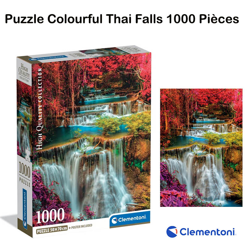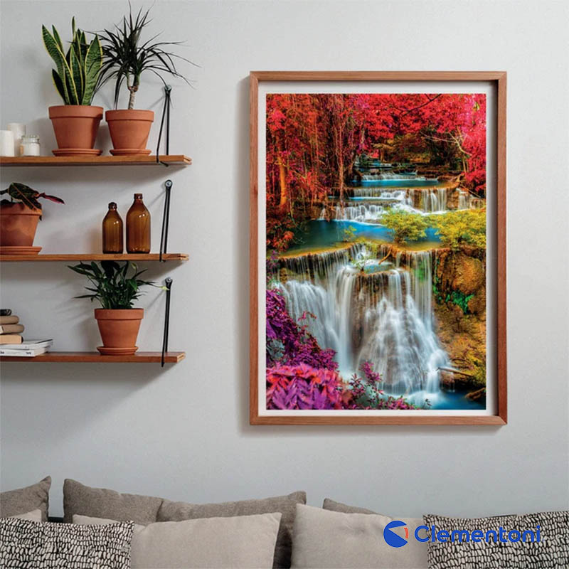 Magnifique puzzle de 1000 pièces signé Clementoni, représentant un paysage spectaculaire de cascades turquoise entourées de végétation aux couleurs vibrantes.