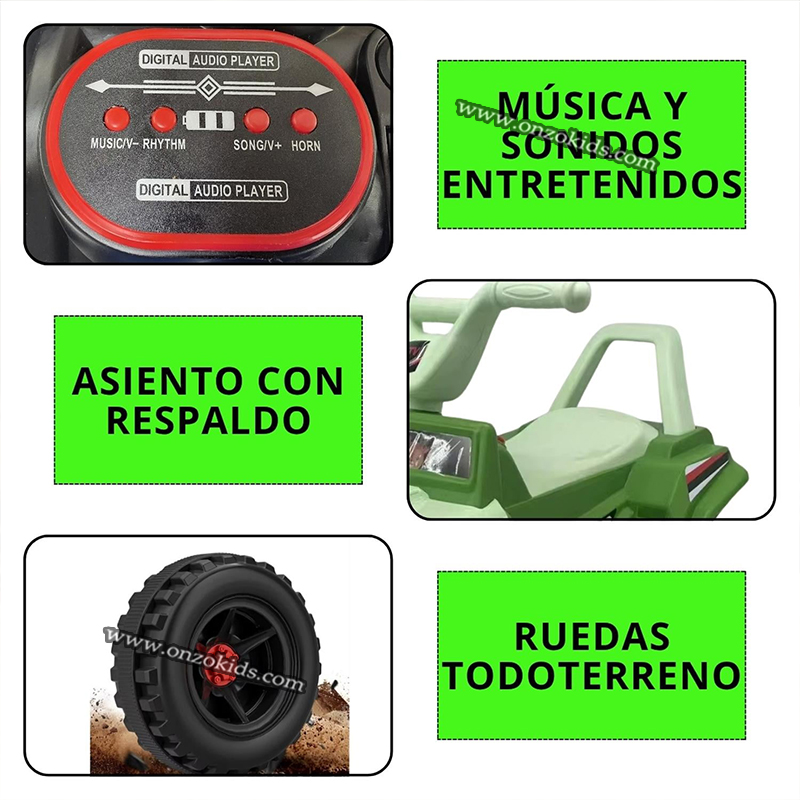 Caractéristiques spéciales : Freinage automatique, marche avant/point mort/marche arrière, entrée AUX, sons préenregistrés