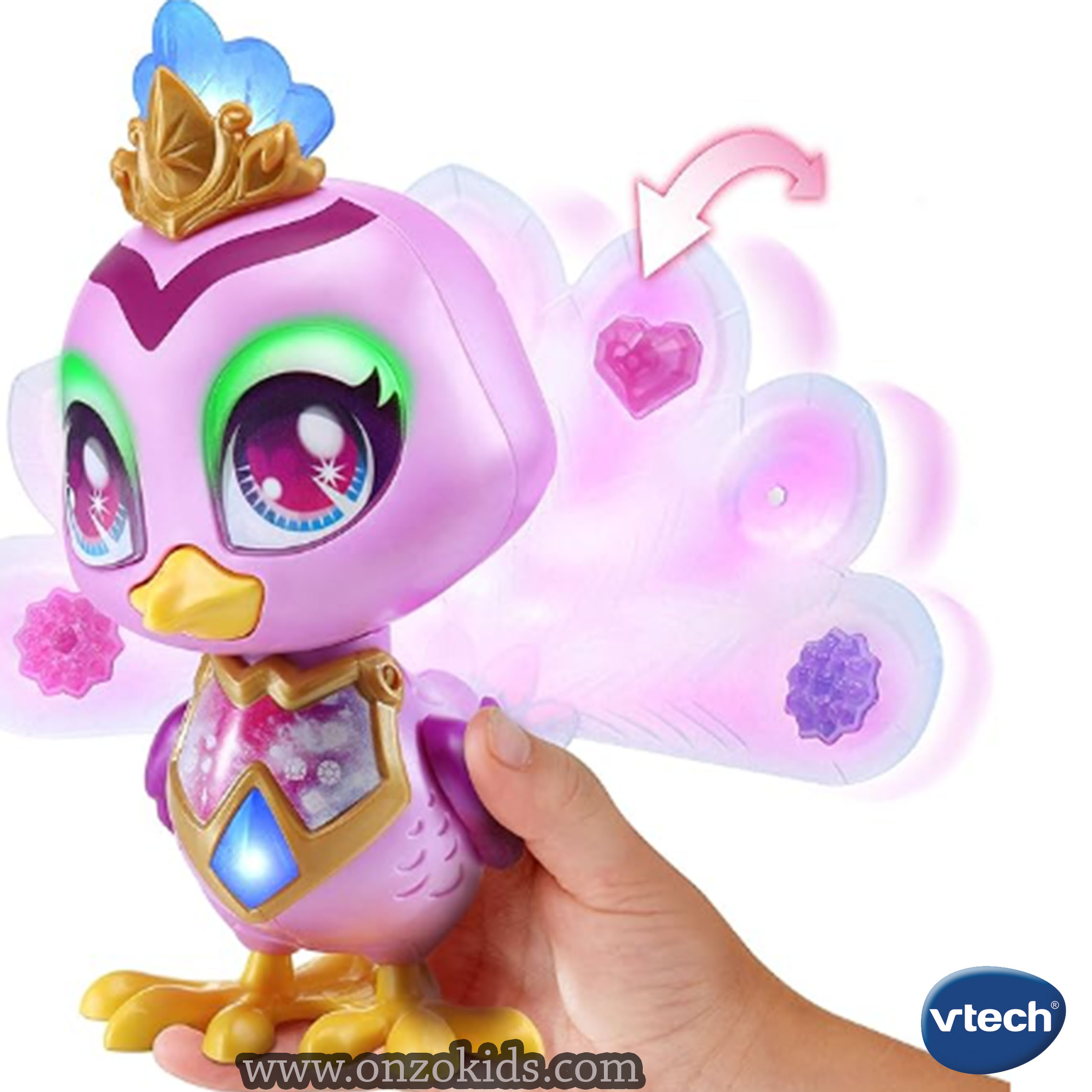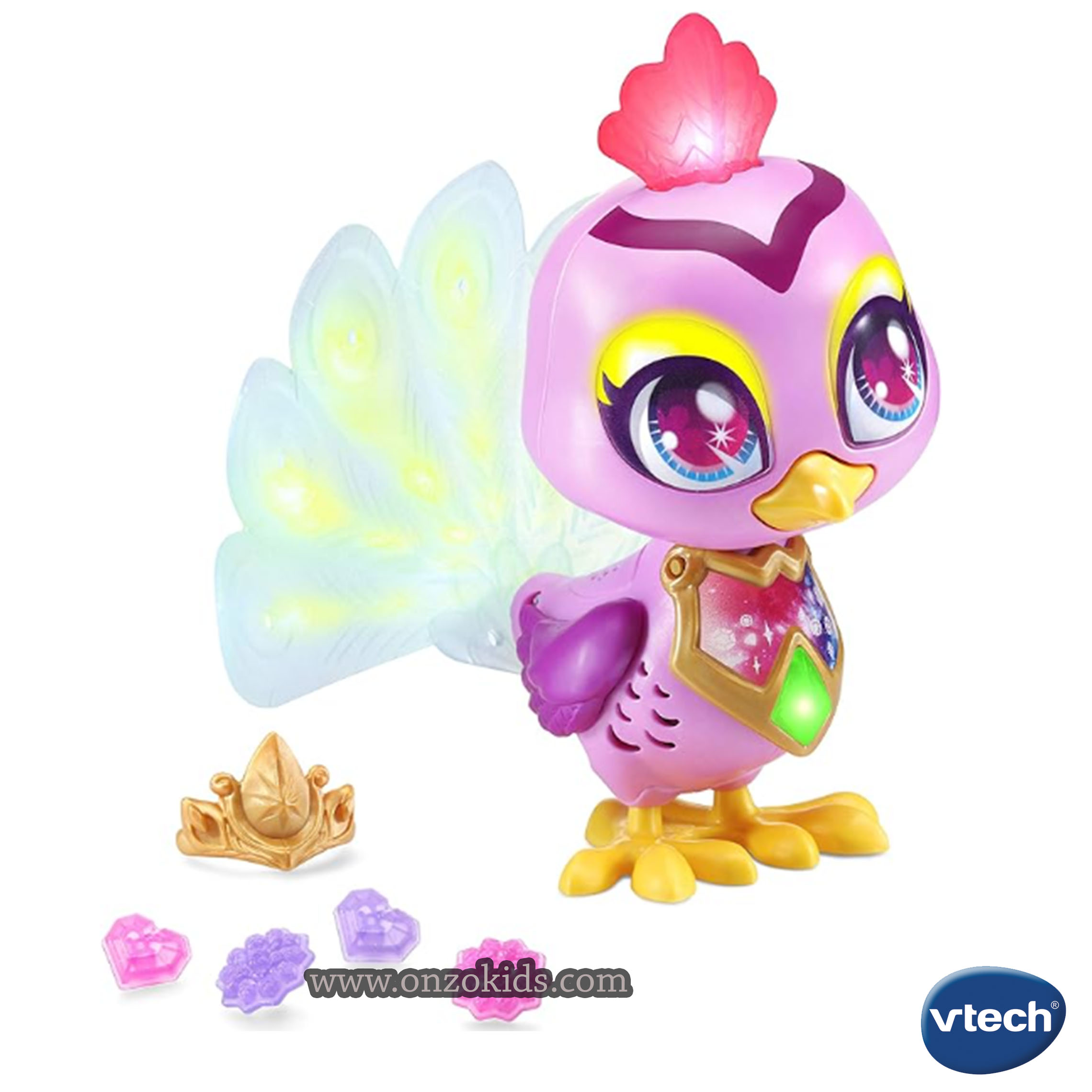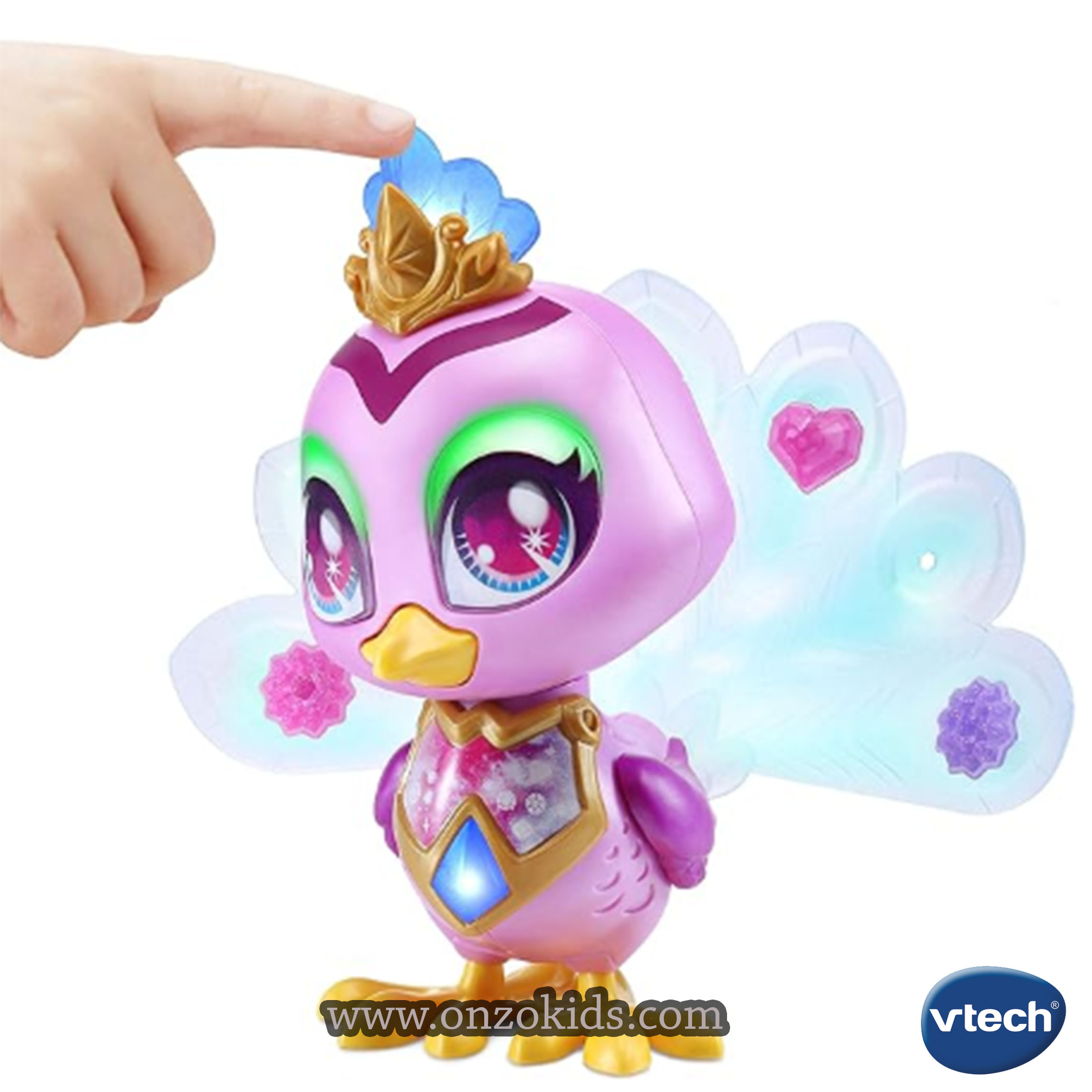 - Ce magnifique jouet en forme de paon parle, chante et s’illumine avec un kaléidoscope de couleurs. Touchez le collier magique de Penny, le cimier, les yeux et la queue pour en changer la couleur.