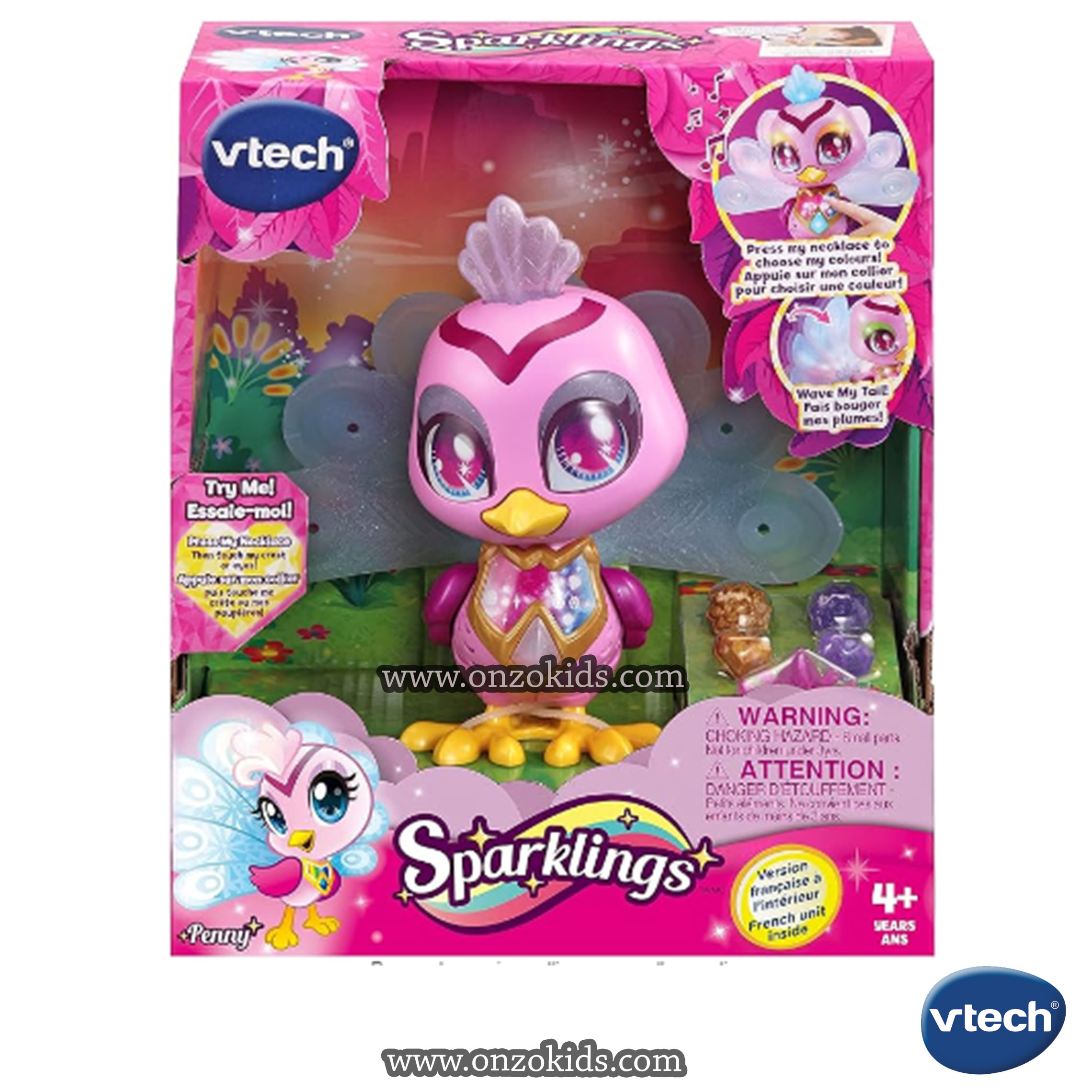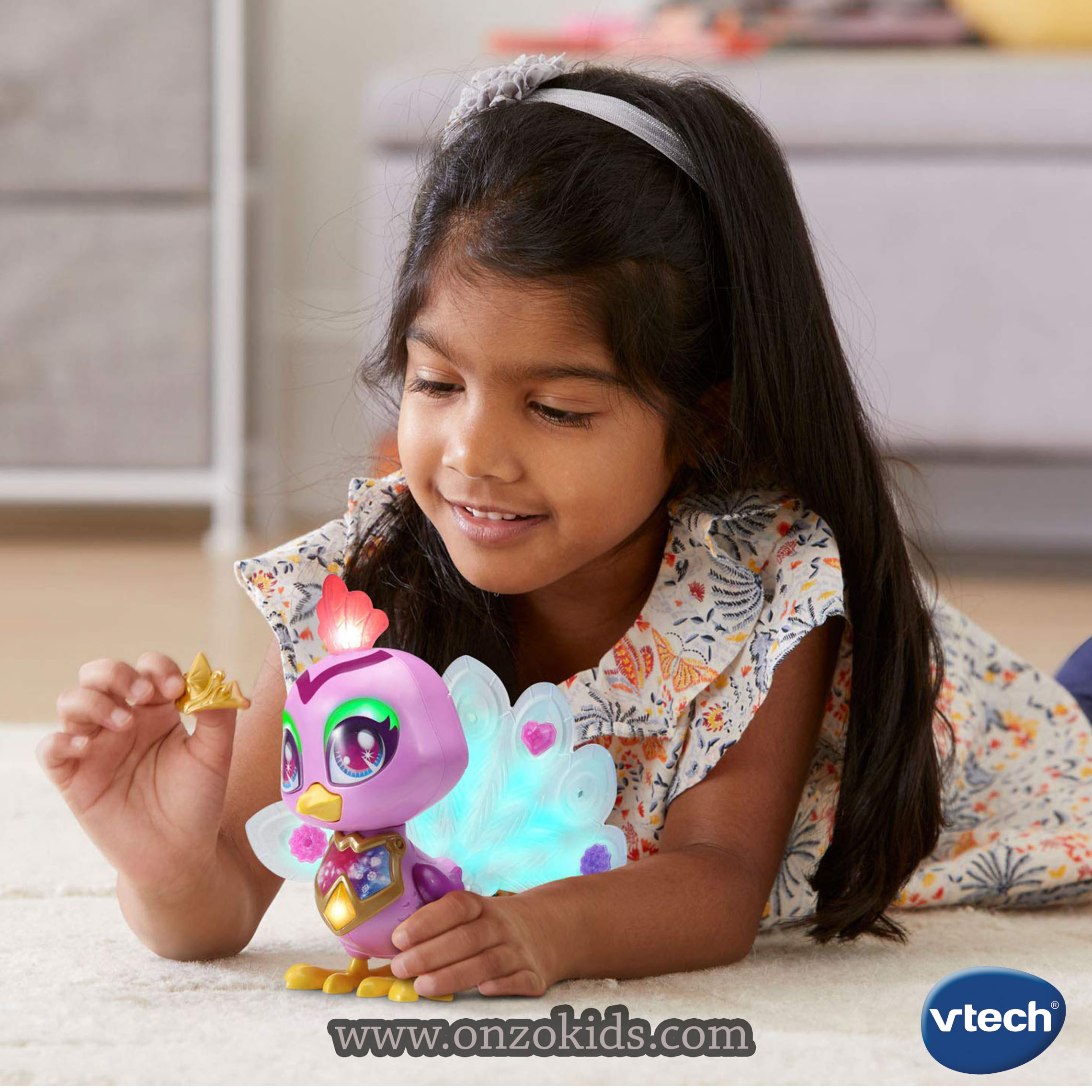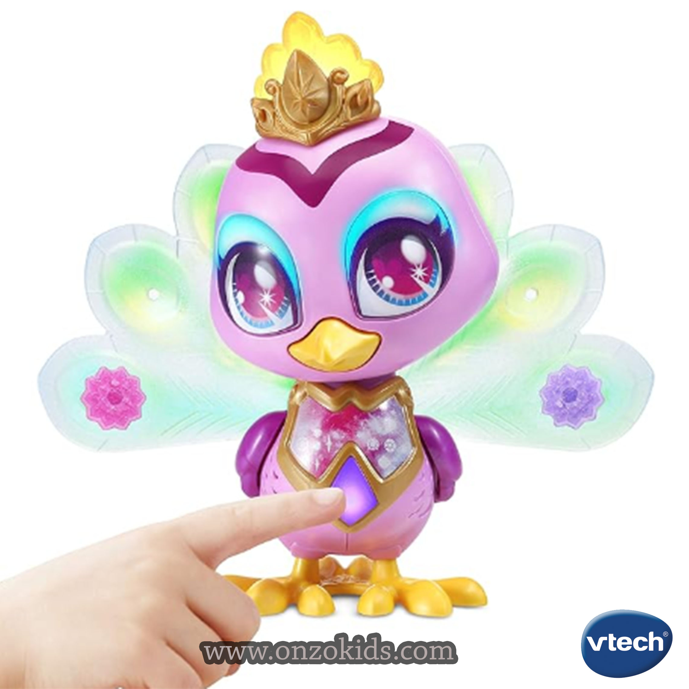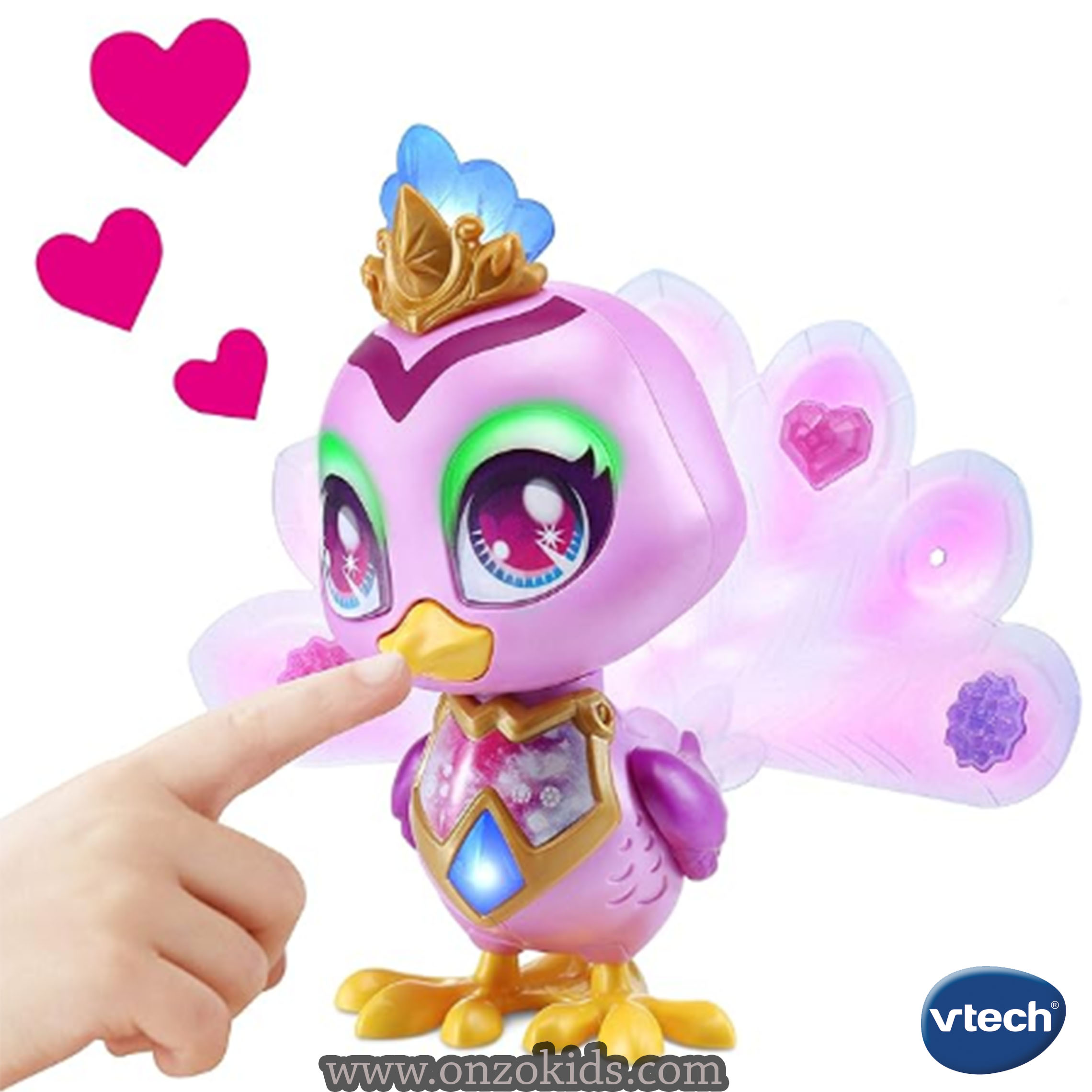 - Ce magnifique jouet en forme de paon parle, chante et s’illumine avec un kaléidoscope de couleurs. Touchez le collier magique de Penny, le cimier, les yeux et la queue pour en changer la couleur.