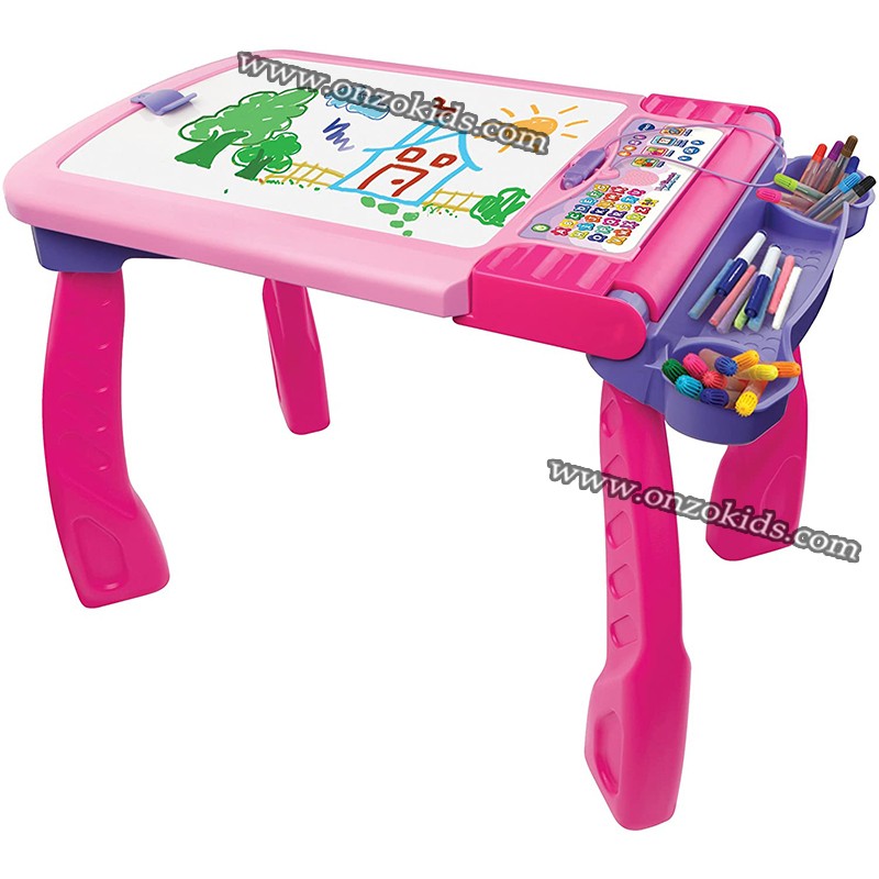 - Des voix et des effets lumineux se déclenchent lorsque l’enfant se met à dessiner ou appuie sur les boutons du tableau d’activités