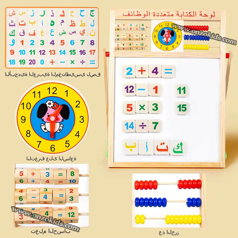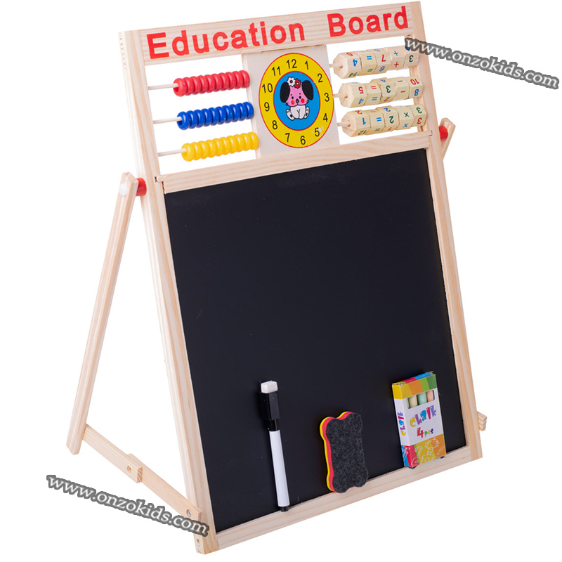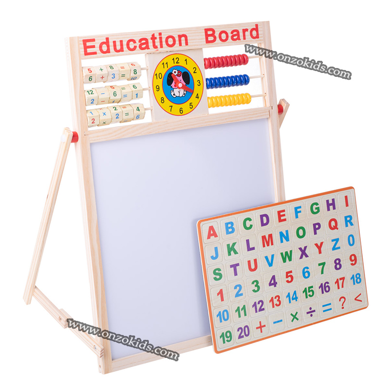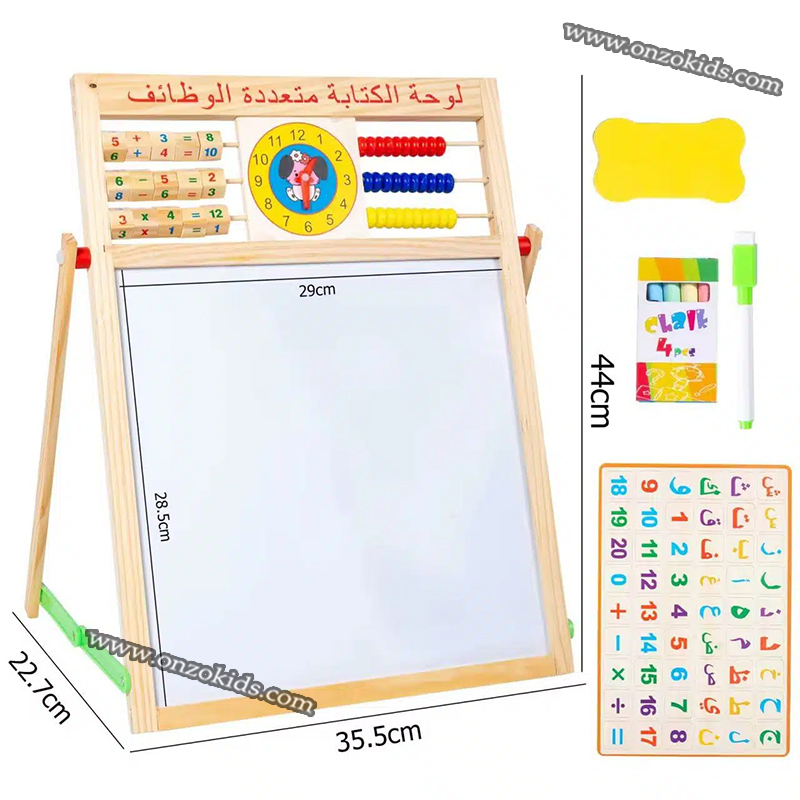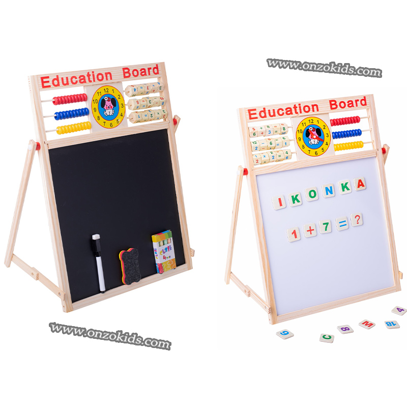 – 1 tableau d’écriture magnétique double face multifonction en bois, alphabets magnétiques, chiffres, 1 plumeau, 1 marqueur, craie Tableau d’écriture magnétique double face en bois