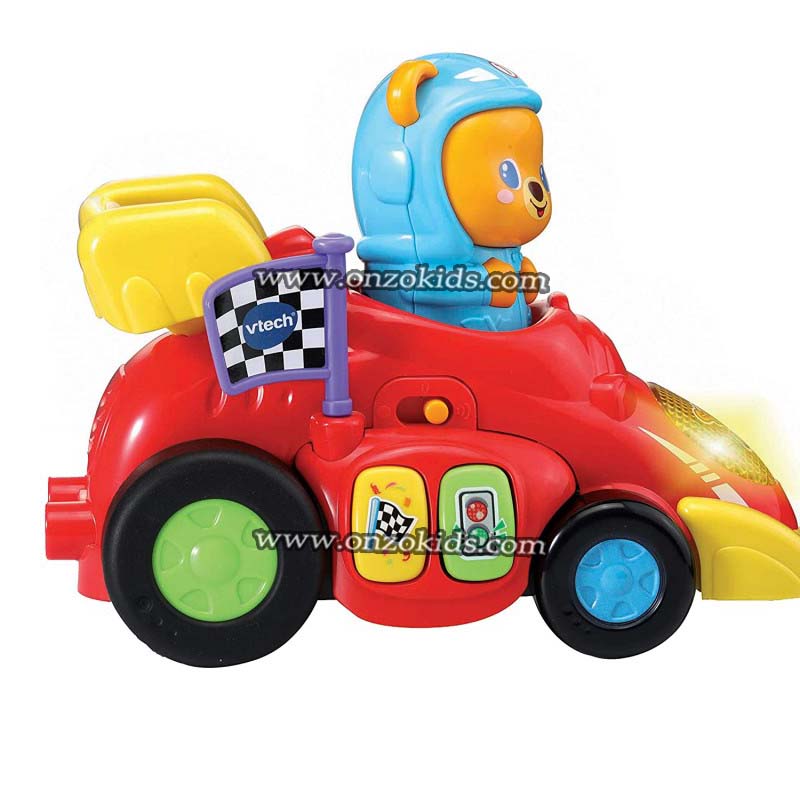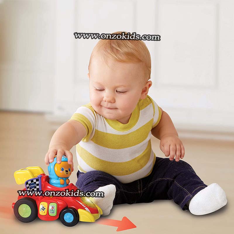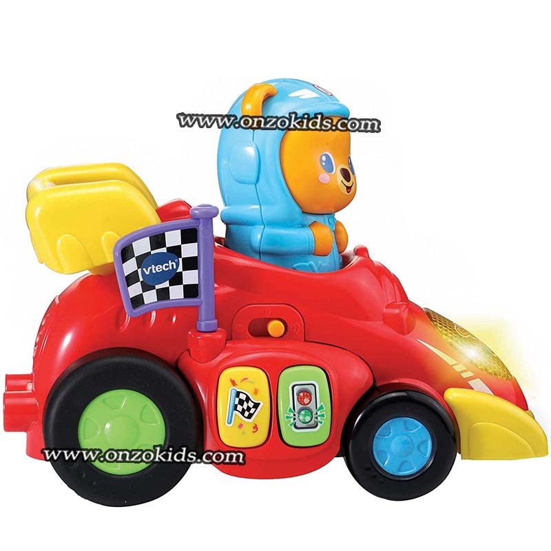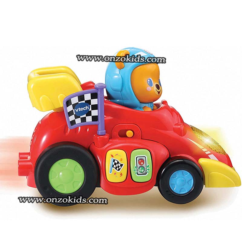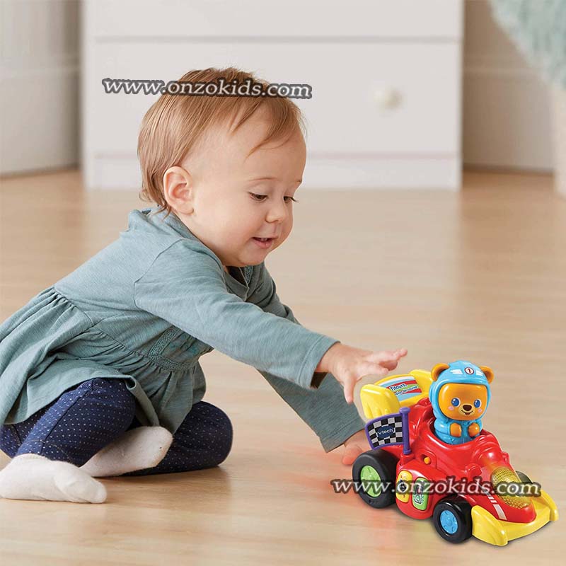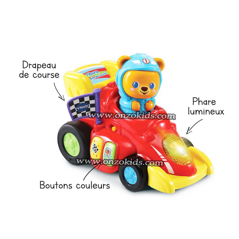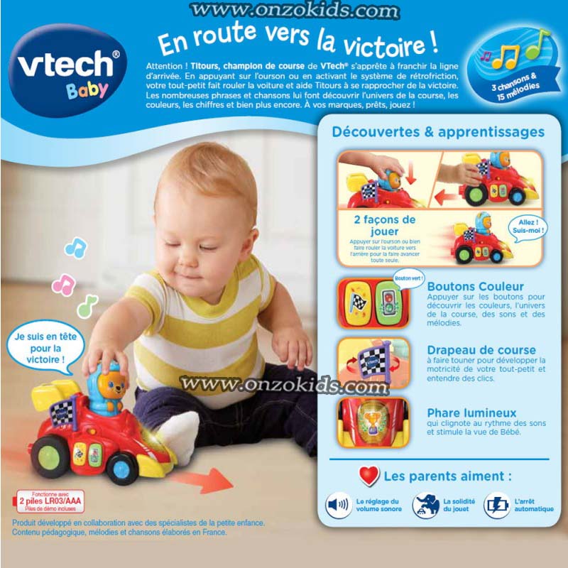 Attention ! Titours, champion de course s’apprête à franchir la ligne d’arrivée. En appuyant sur l’ourson ou en activant le système de rétrofriction, votre tout-petit fait rouler la voiture et aide Titours à se rapprocher de la victoire !