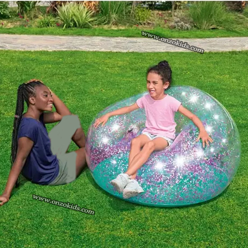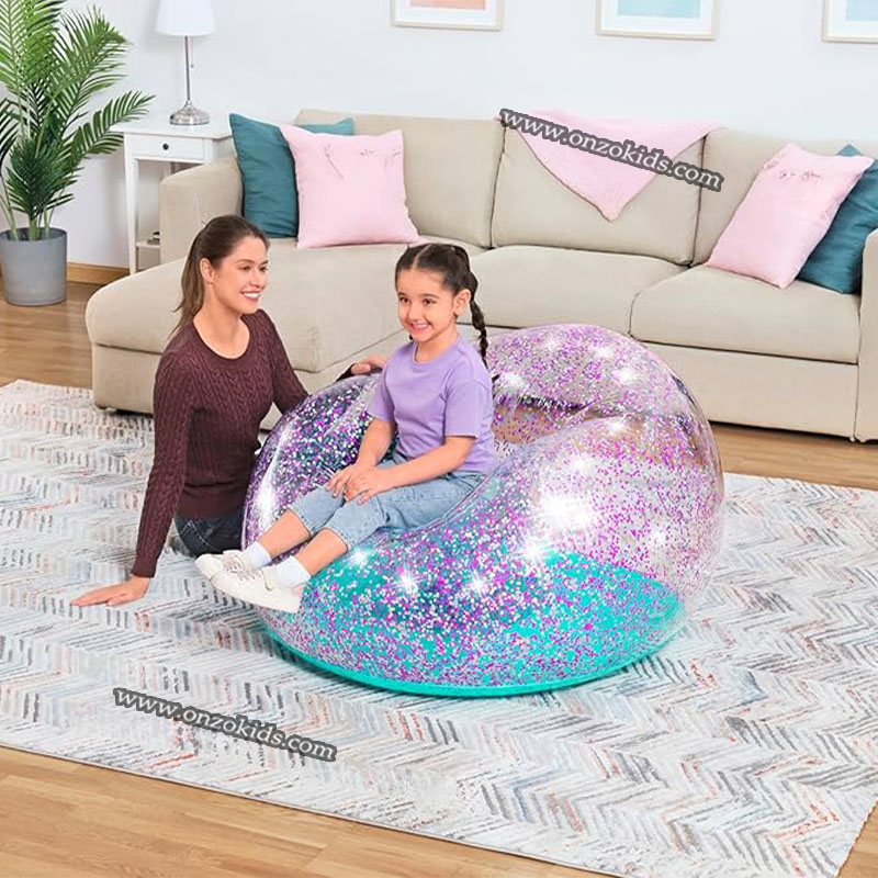 Il se distingue par son design pailleté (argenté et violet) et sa fabrication en PVC durable, offrant une assise confortable et résistante.