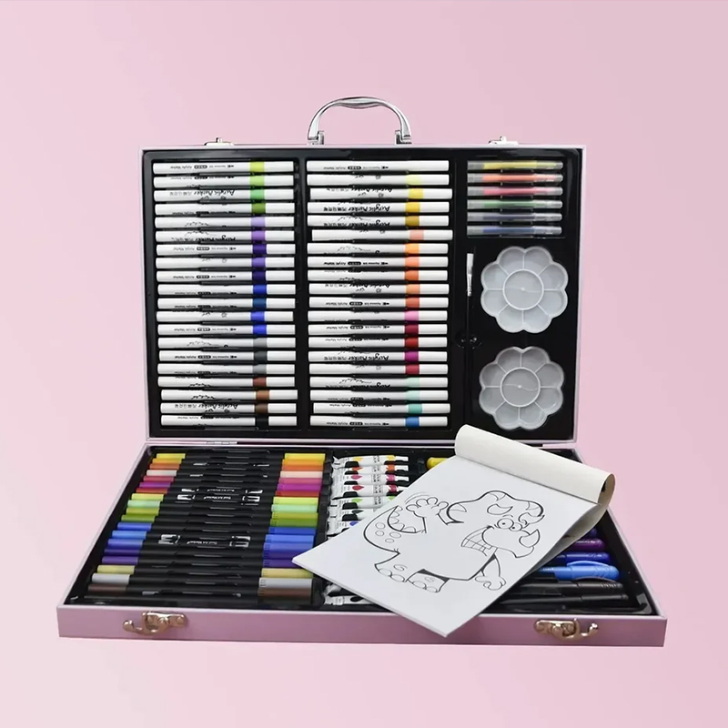 Coffret de dessin complet pour enfants comprenant 113 accessoires créatifs : feutres, crayons de couleur, crayons de cire ou pastels, peintures aquarelles, pinceau, palette et autres outils de dessin.